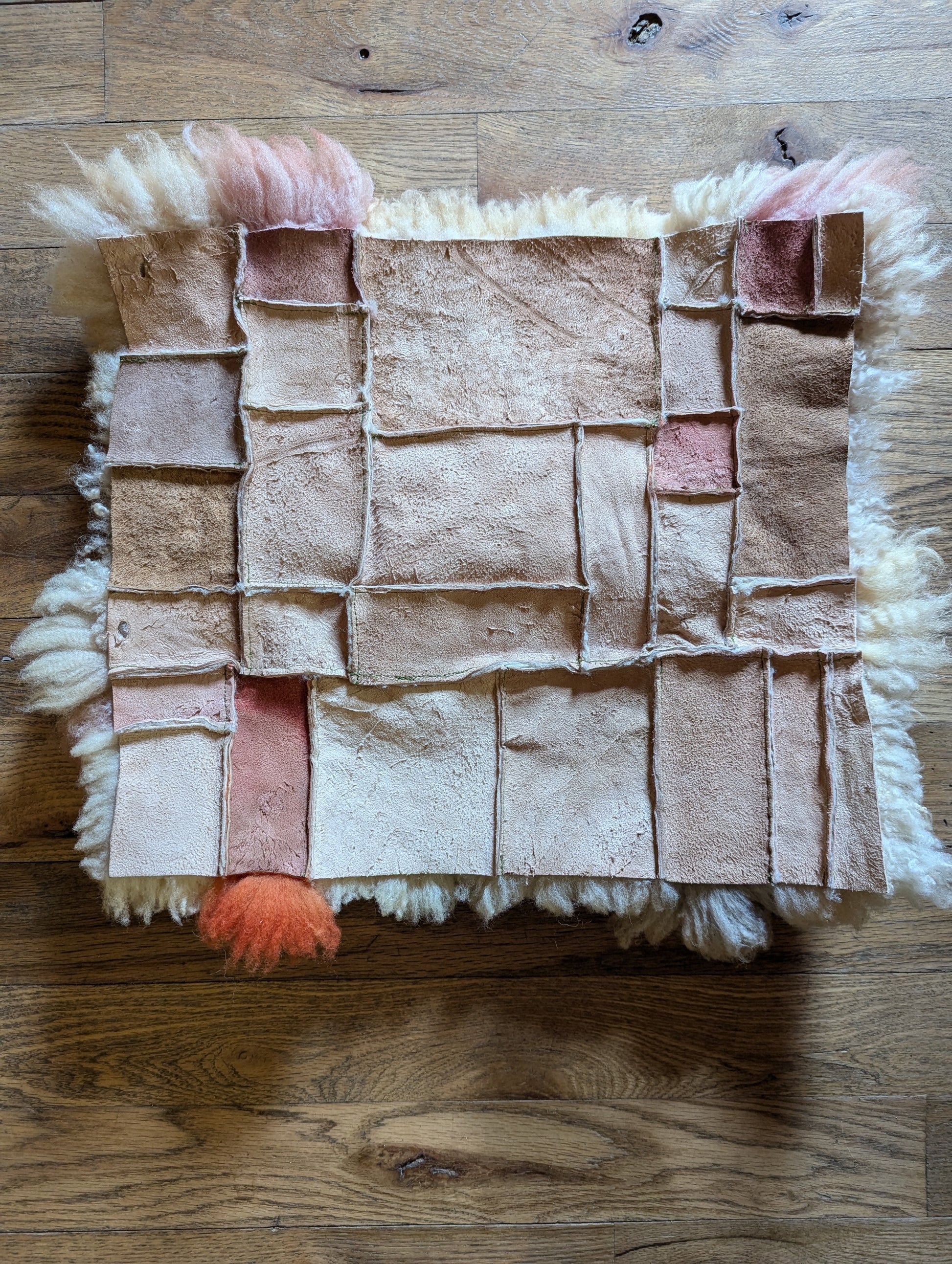 This patchwork sheepskin is sewn together from many different naturally tanned cream, off white and plant dyed (madder root, lac and cutch) scraps. Use it as a sit mat, bedside rug, car seat warmer, or a light packable sheepskin to go on summer adventures.