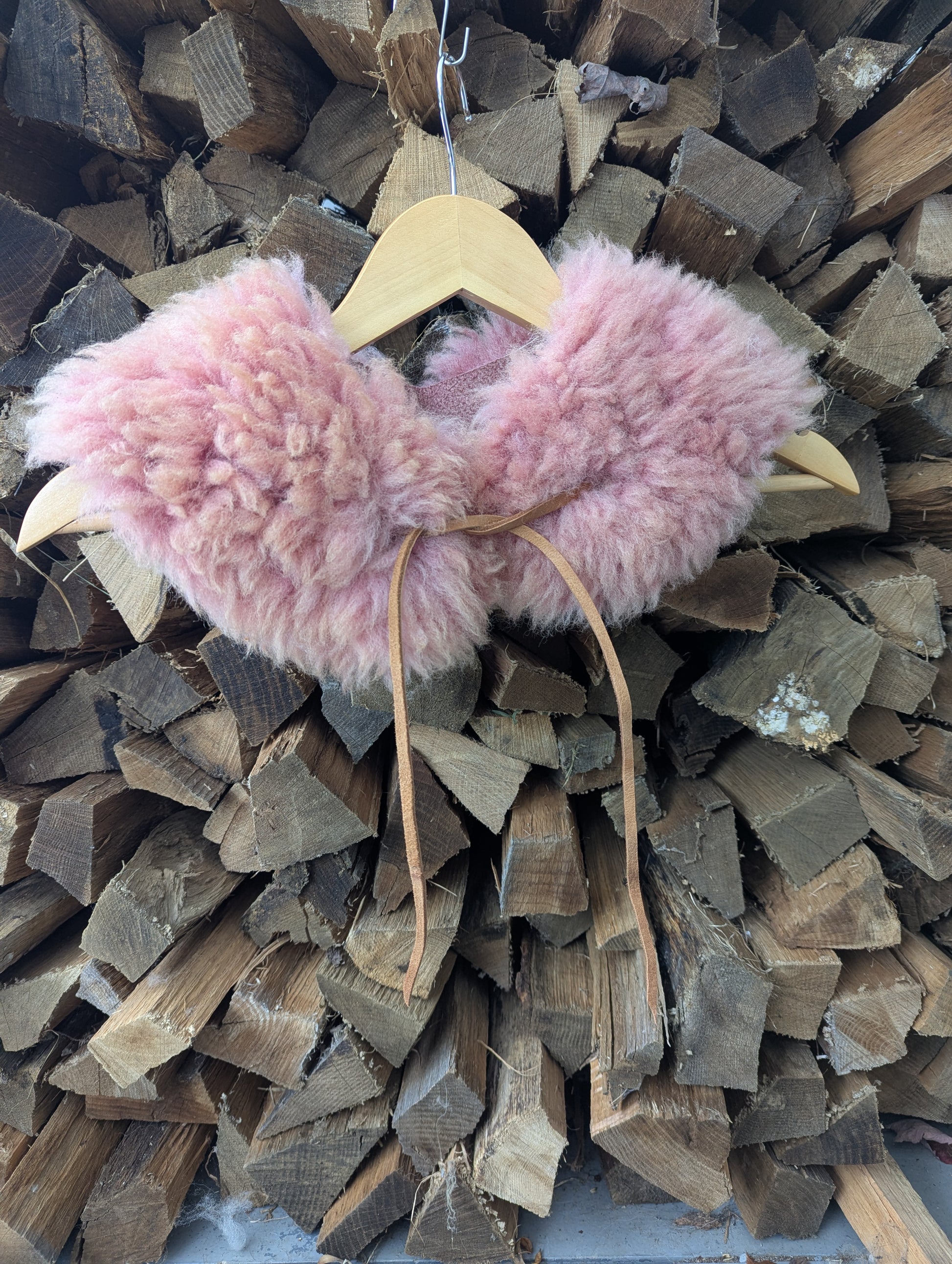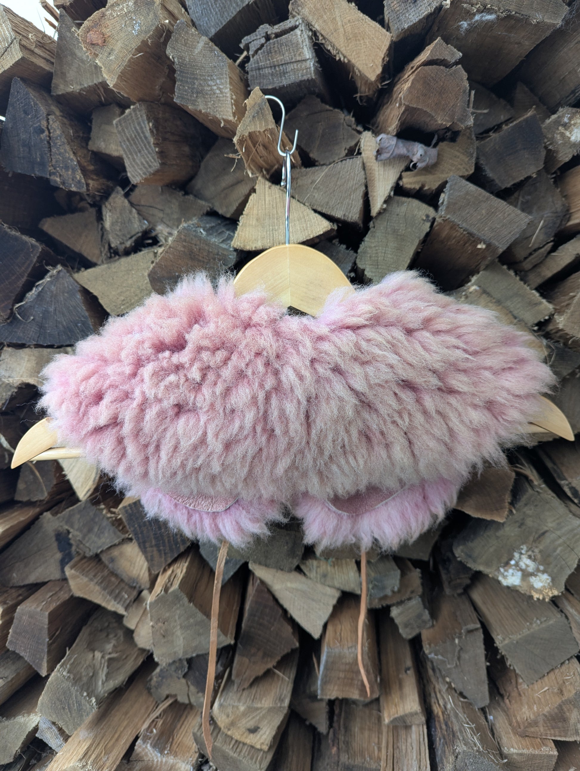 Medium short dense wool naturally dyed to a raspberry pink with lac extract, with long thin sheepskin leather laces.