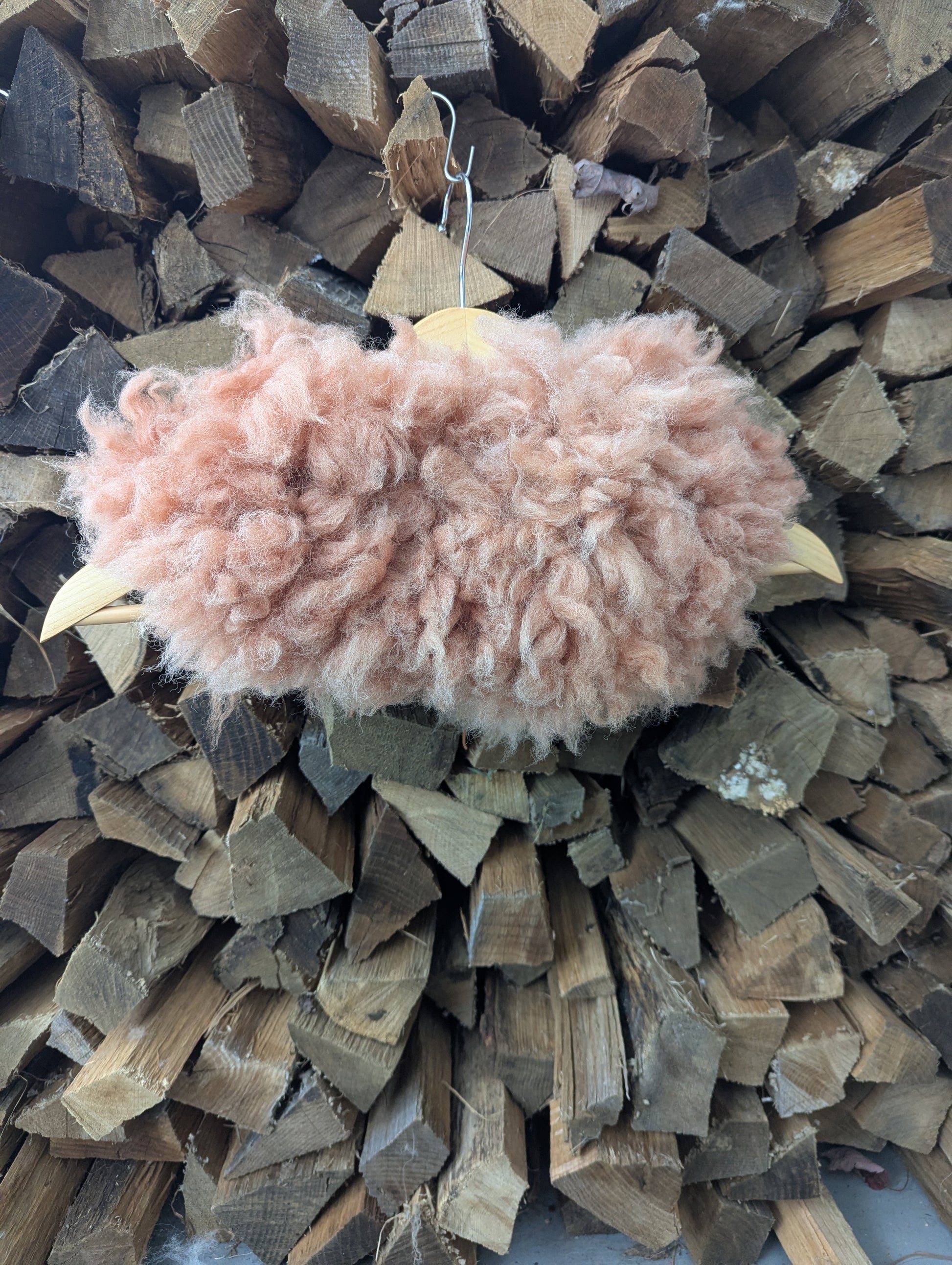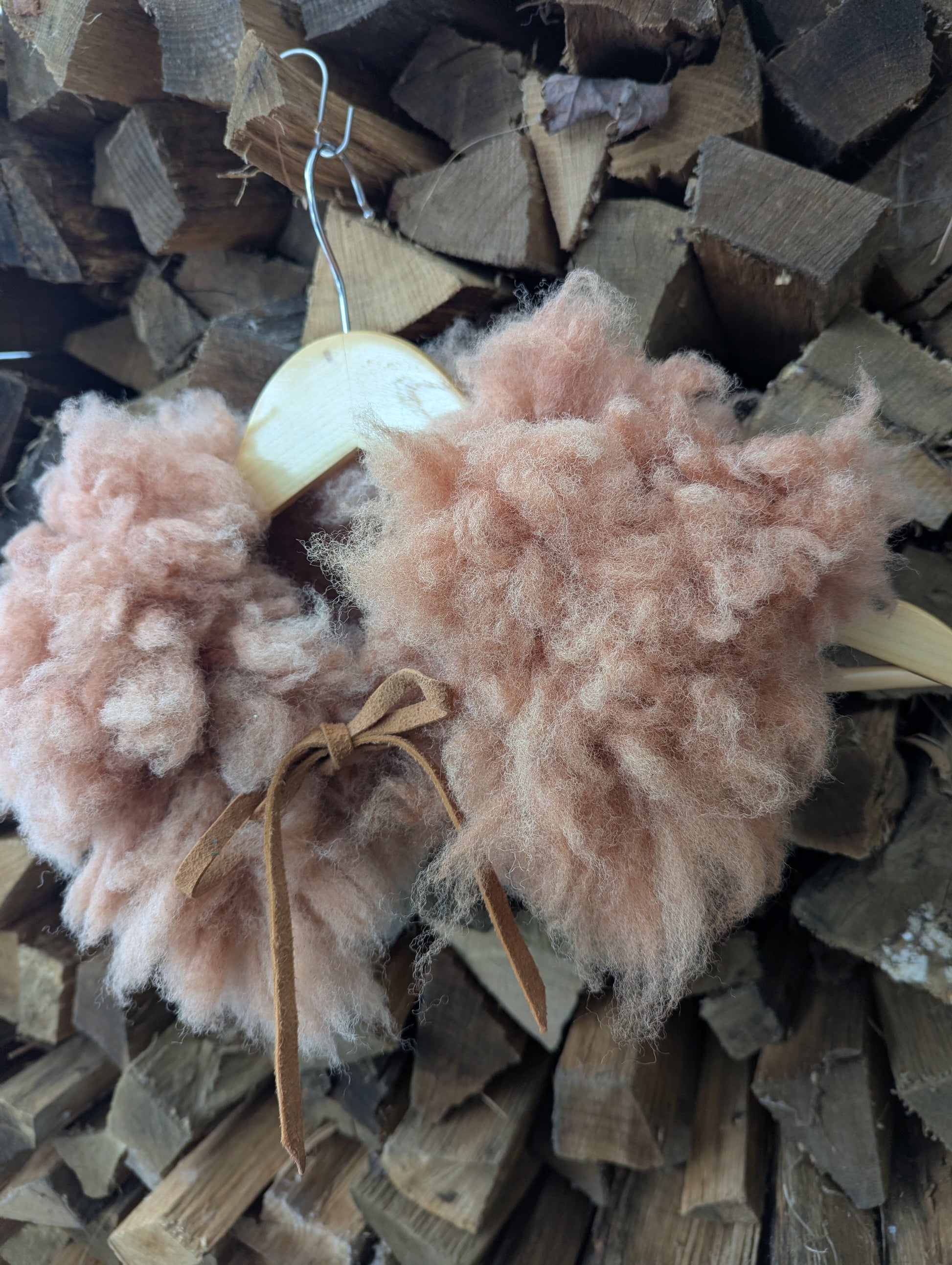 Very lanolin rich, poofy long wool naturally dyed to a salmon pink/coral with madder root, and long thin sheepskin suede laces.
