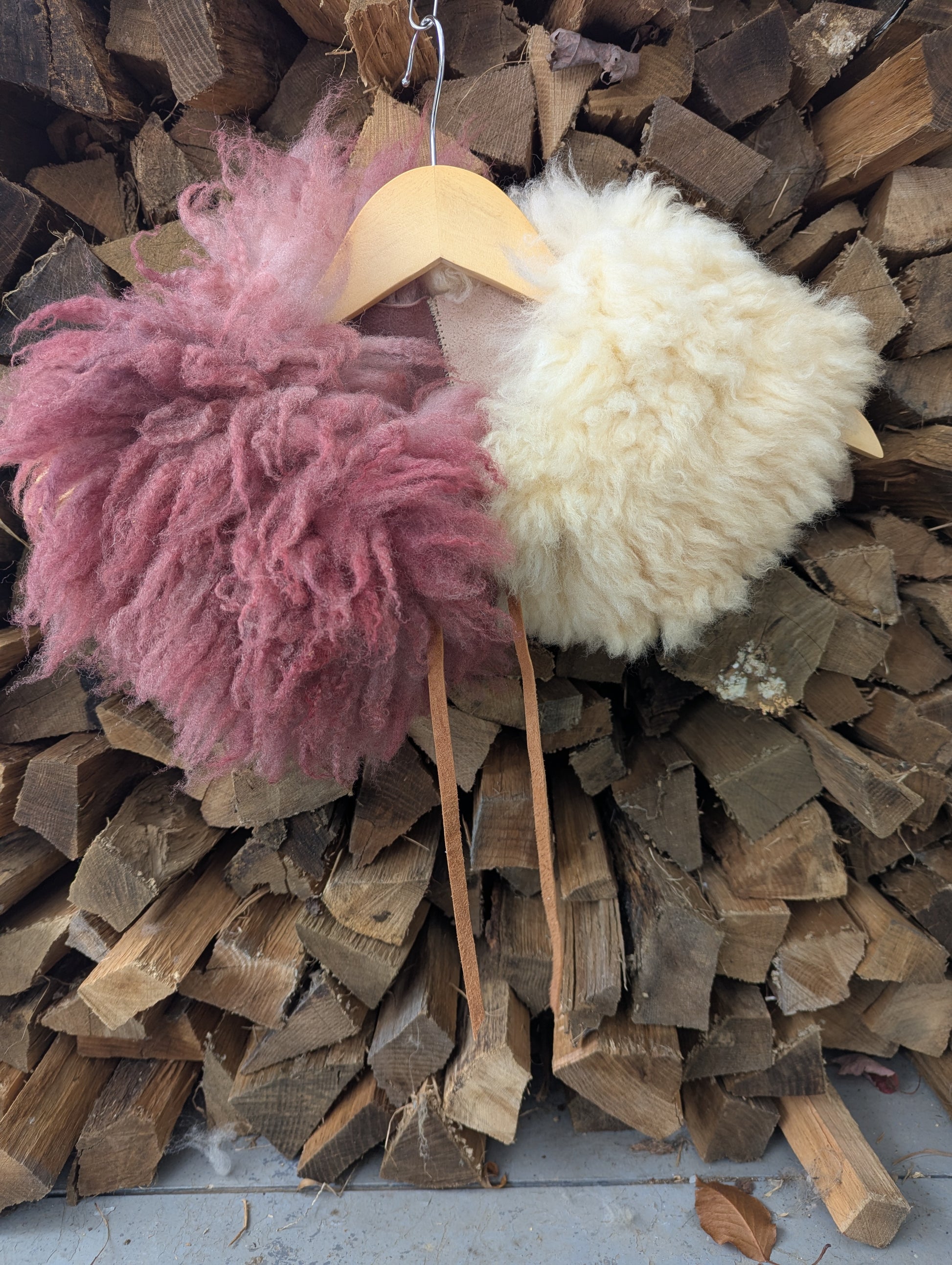 Half & half collar made from a silky, natural white sheepskin and half crimpy longwool naturally dyed to a rich burgundy with madder root and logwood, and long thin sheepskin suede laces. This one is slightly more red than 14 & 15.