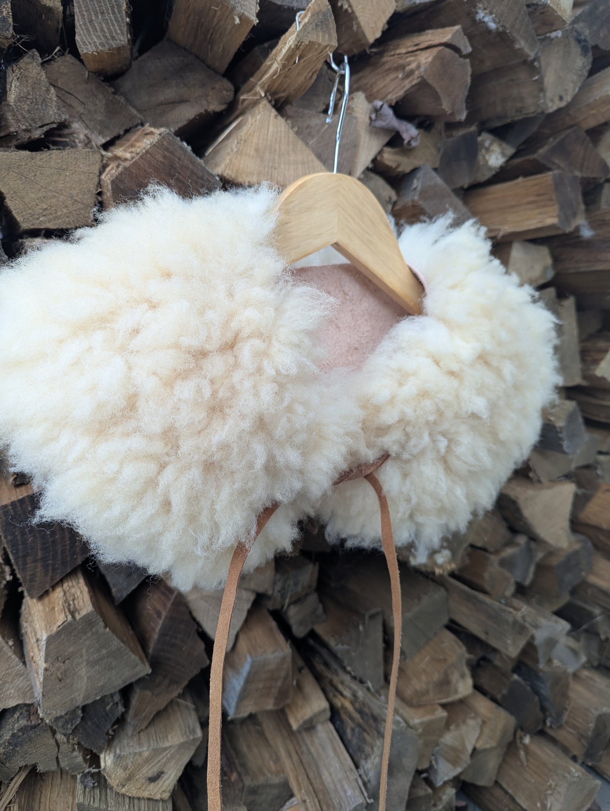 Poofy medium length wool in natural white sheepskin with long thin sheepskin leather laces.