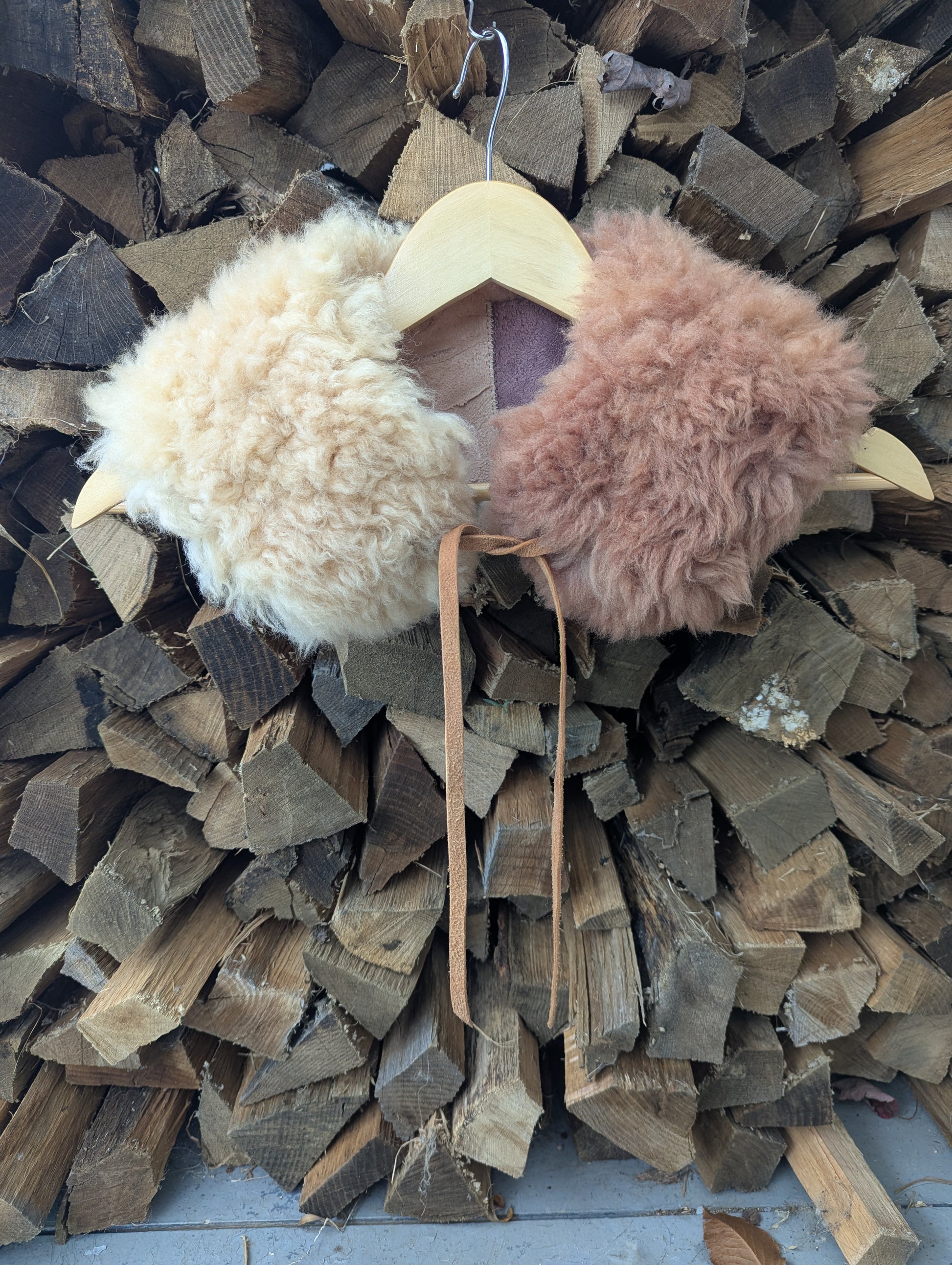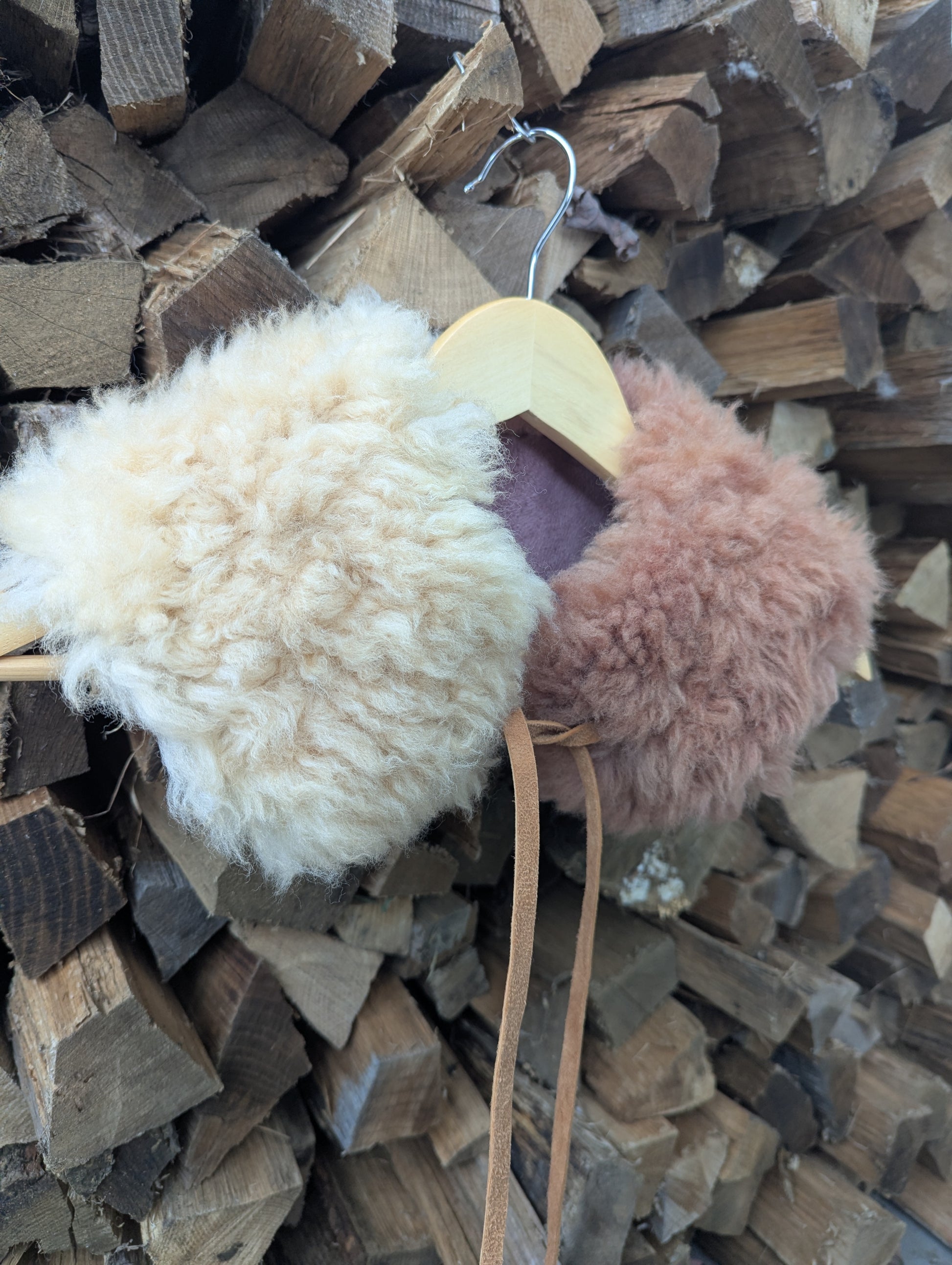 Half & half natural cream and dyed with madder + logwood, with long thin sheepskin suede laces. This is the larger style that sits more wide on the shoulders.