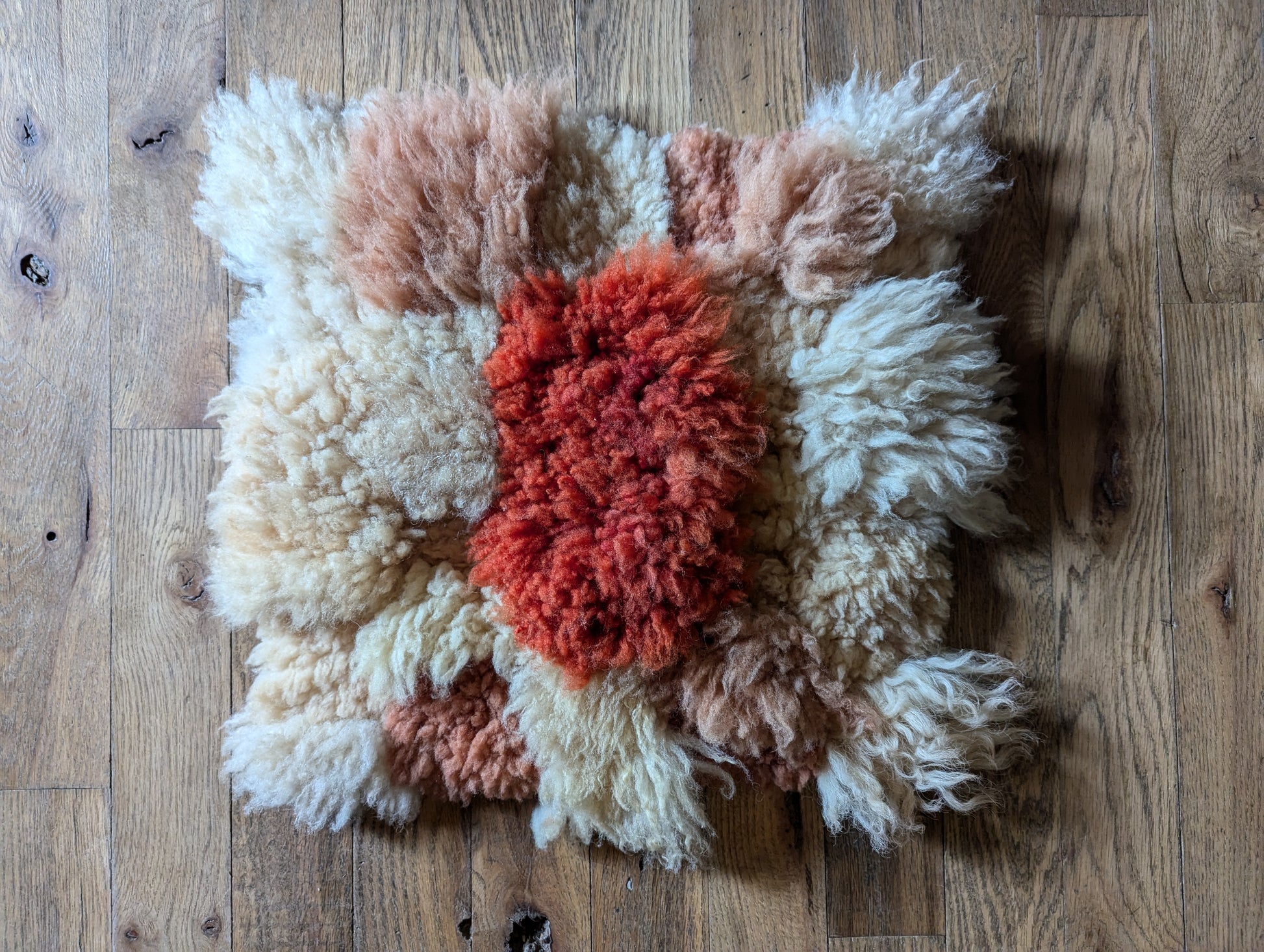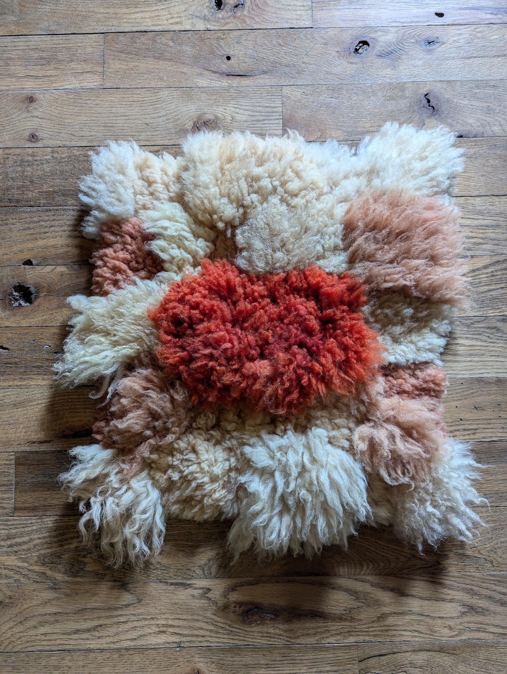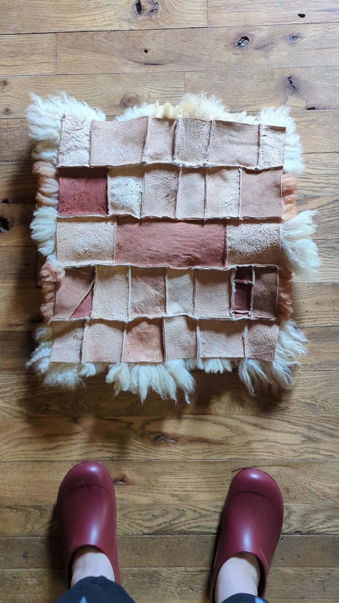 This patchwork sheepskin is sewn together from many different naturally tanned cream, off white and plant dyed (madder root, lac and cutch) scraps. Use it as a sit mat, bedside rug, car seat warmer, or a light packable sheepskin to go on summer adventures.