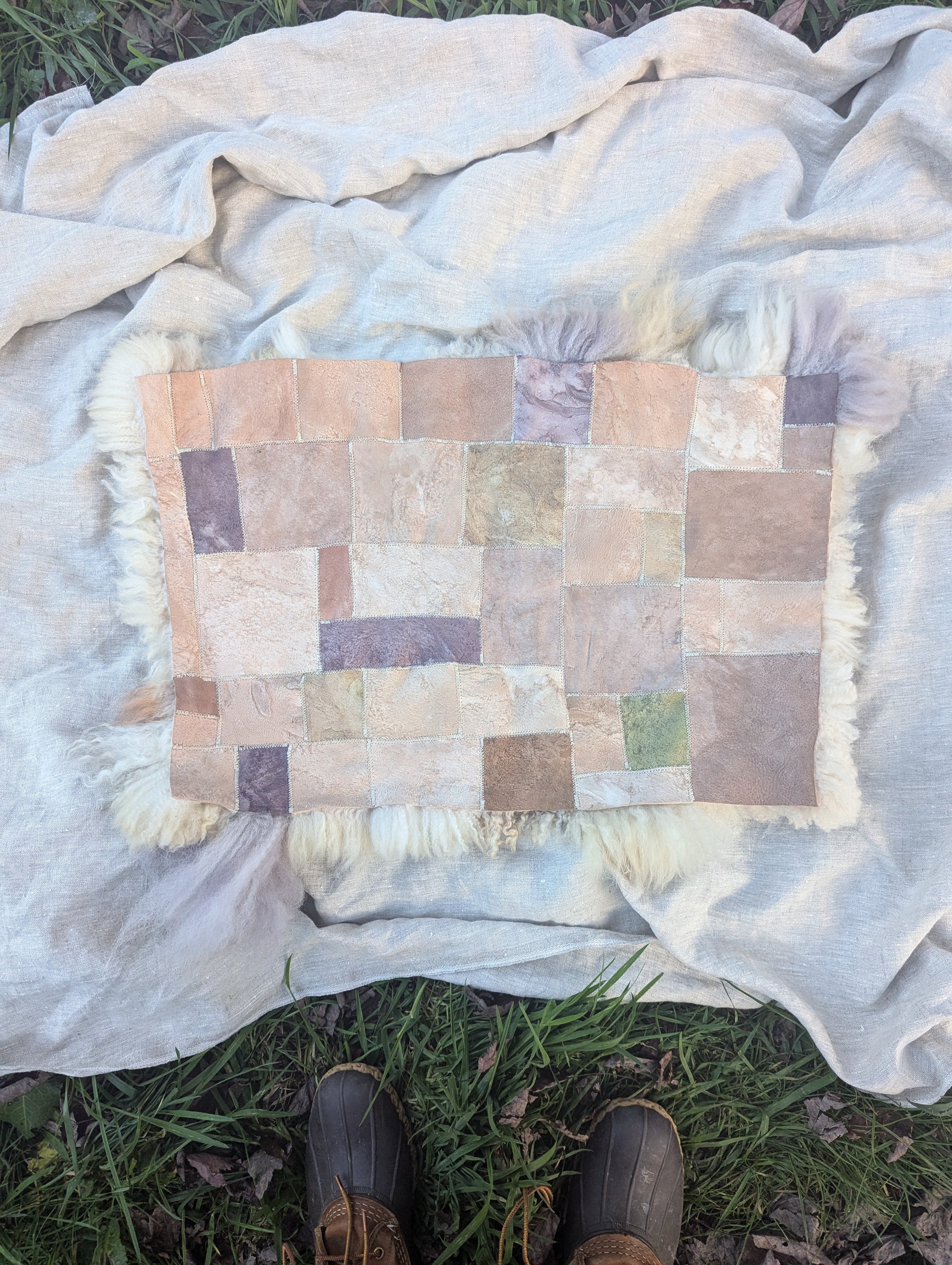 This patchwork sheepskin is sewn together from many different naturally tanned cream, off white and plant dyed (goldenrod, logwood, madder and lac) scraps. Use it as a sit mat, bedside rug, car seat warmer, or a light packable sheepskin to go on summer adventures.