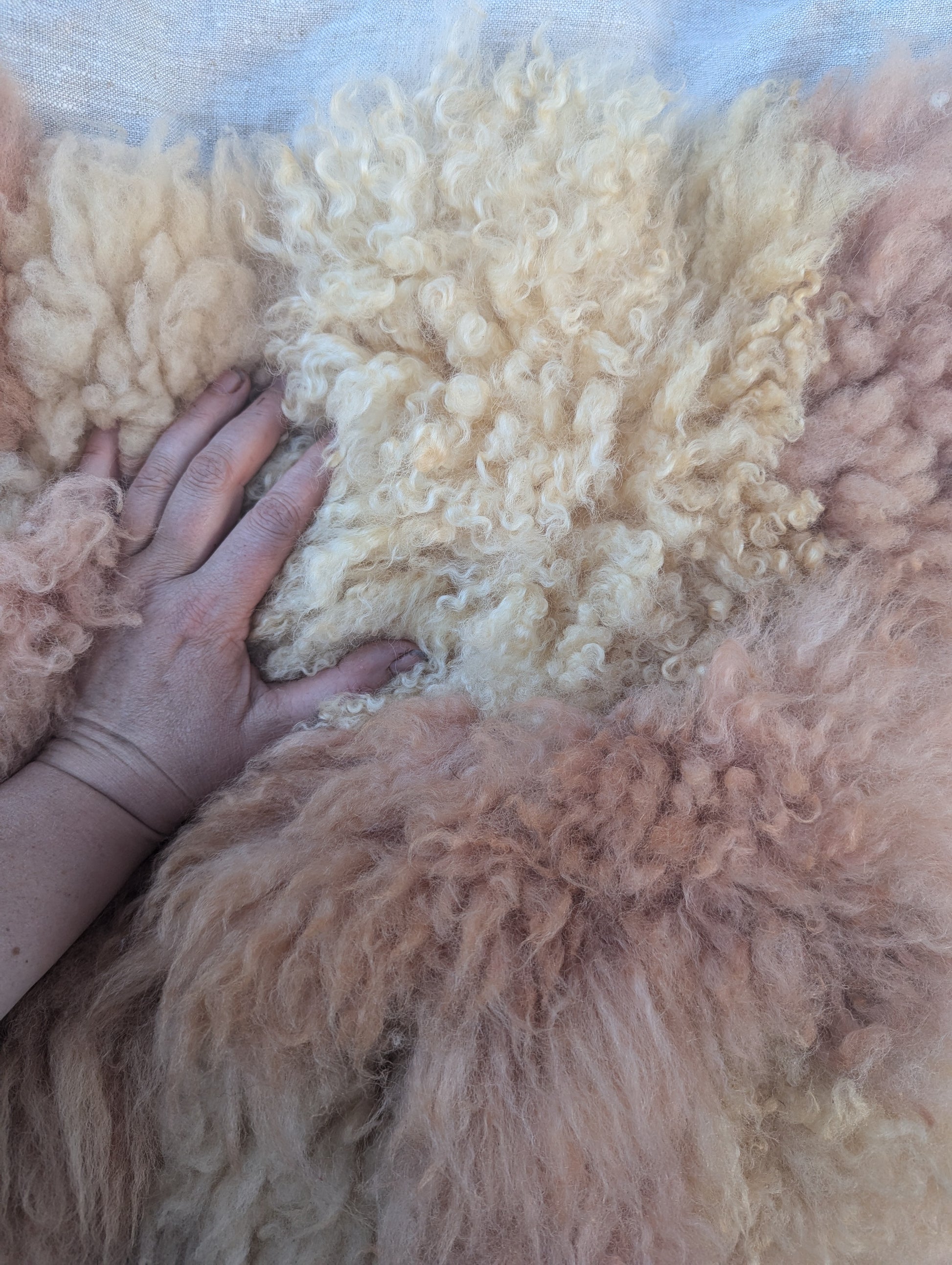 Because the tanning and washing process I use does not involve harsh petroleum-derived solvents, and instead mostly handwork, the wool may contain seeds or small pieces of leaves and other vegetable matter, and it may also retain a faint smell of sheep and bark. Enjoy it! To care for this hide, air it out often. You can handwash with warm water and soap and line dry, or fill your washer and allow to soak. More info on my process, cleaning & care.