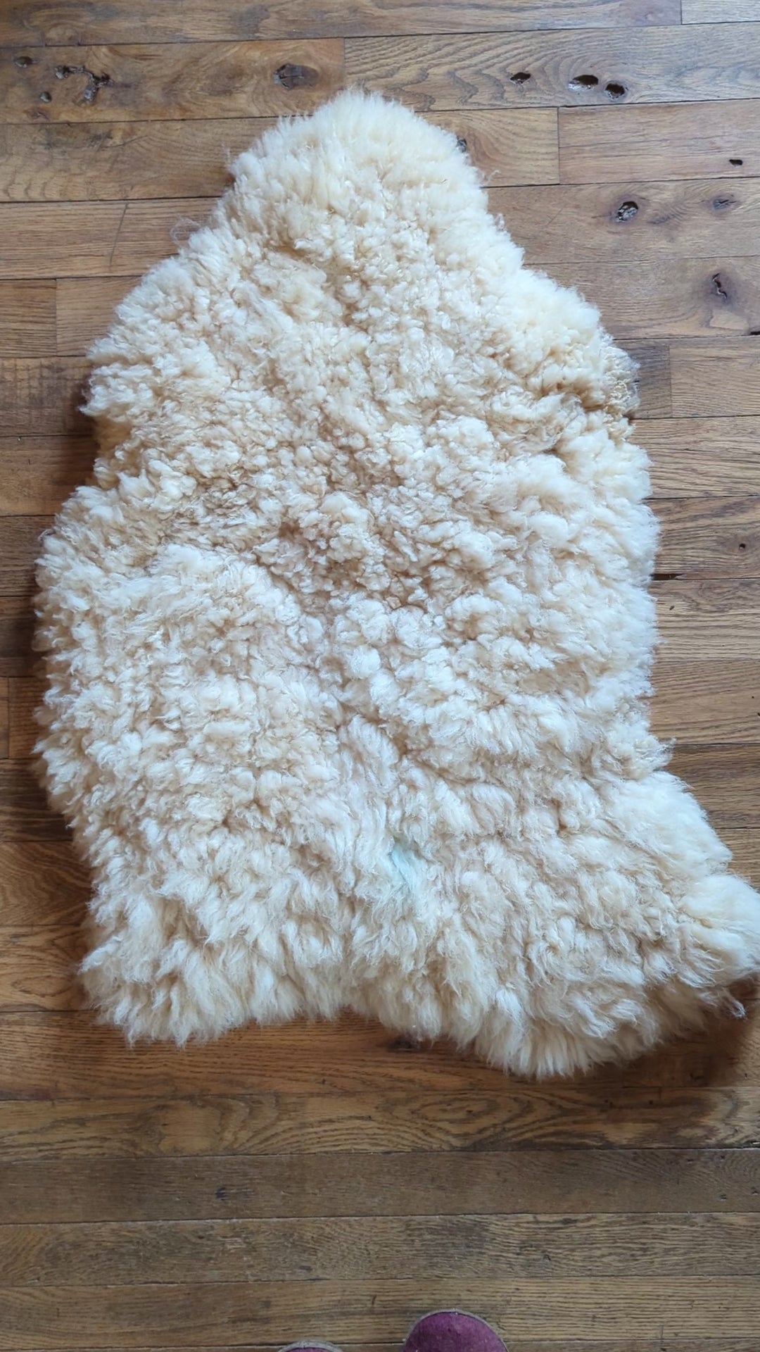Because the tanning and washing process I use does not involve harsh petroleum-derived solvents, and instead mostly handwork, the wool may contain seeds or small pieces of leaves and other vegetable matter, and it may also retain a faint smell of sheep and bark. Enjoy it! To care for this hide, air it out often. You can handwash with warm water and soap and line dry, or fill your washer and allow to soak. More info on my process, cleaning & care.