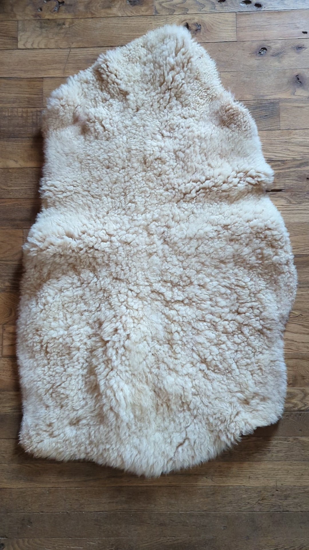 Because the tanning and washing process I use does not involve harsh petroleum-derived solvents, and instead mostly handwork, the wool may contain seeds or small pieces of leaves and other vegetable matter, and it may also retain a faint smell of sheep and bark. Enjoy it! To care for this hide, air it out often. You can handwash with warm water and soap and line dry, or fill your washer and allow to soak. More info on my process, cleaning & care.