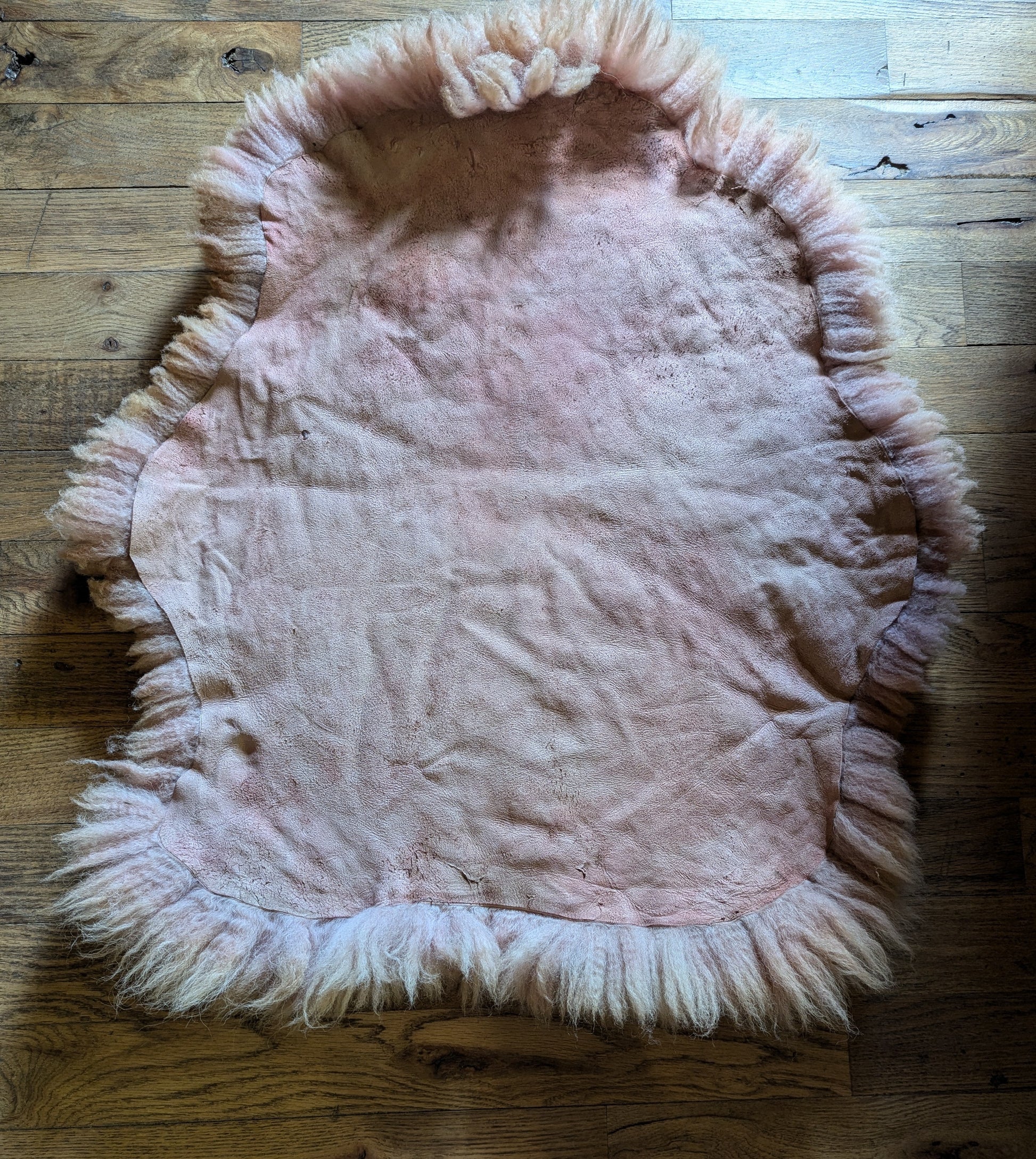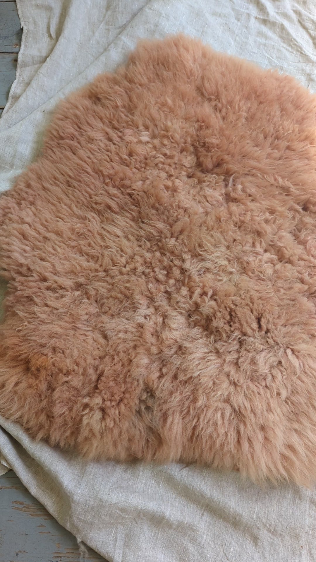 This sheepskin has curly, medium length 3-4" locks, and has been dyed with alum & madder root to a lovely even salmon pink. There is one small blue shepherds mark on the lower edge that mostly blends into the dye. The leather on this is particularly supple, with just one tiny hole.
