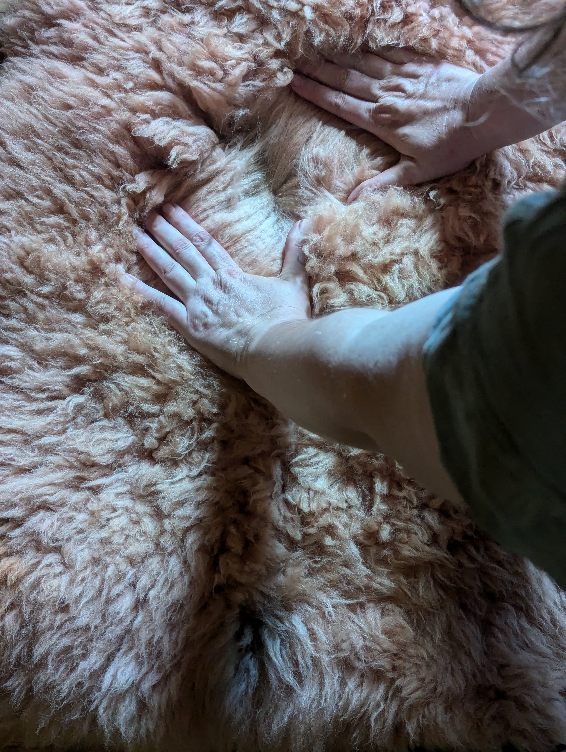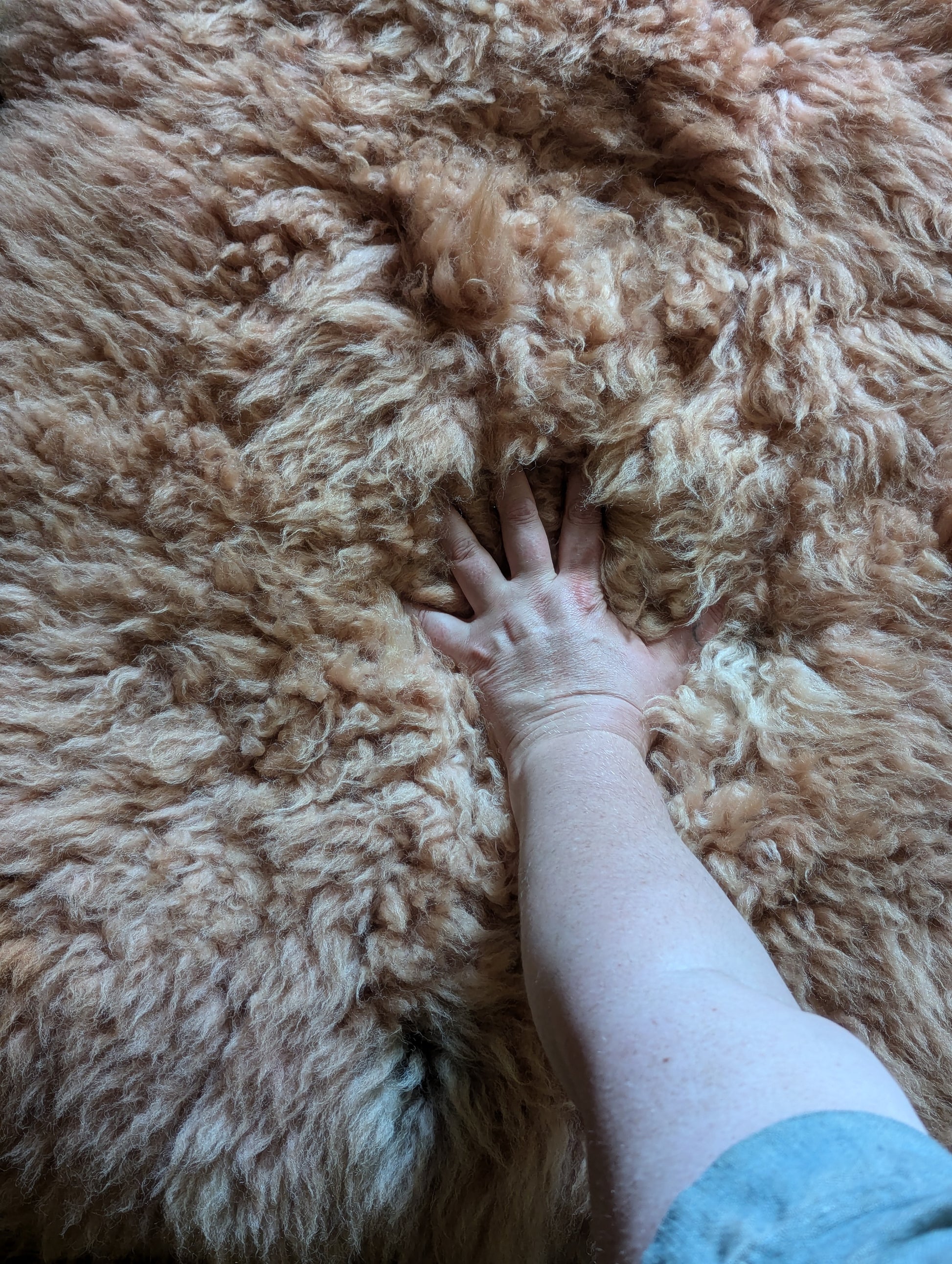 Because the tanning and washing process I use does not involve harsh petroleum-derived solvents, and instead mostly handwork, the wool may contain seeds or small pieces of leaves and other vegetable matter, and it may also retain a faint smell of sheep and bark. Enjoy it! To care for this hide, air it out often. You can handwash with warm water and soap and line dry, or fill your washer and allow to soak. More info on my process, cleaning & care.