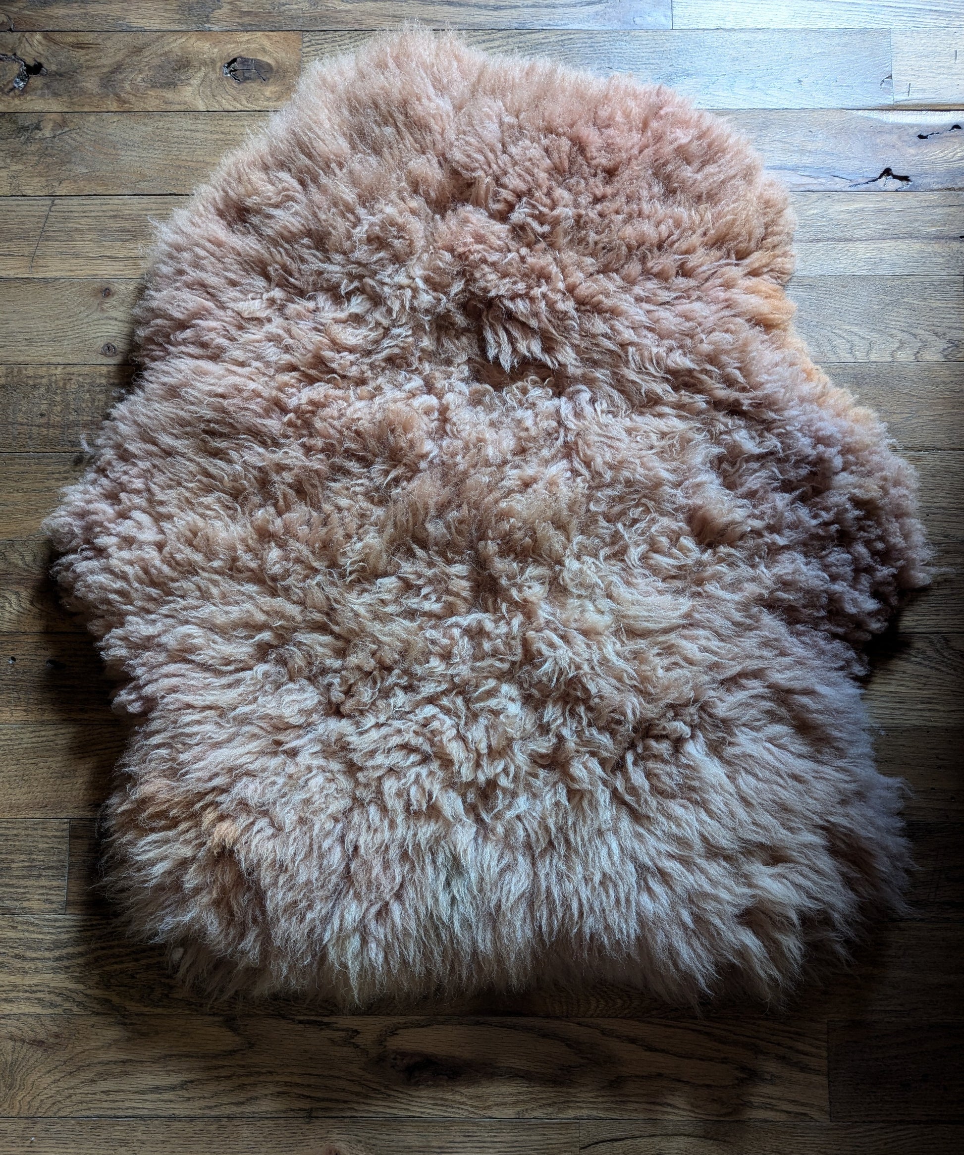 This sheepskin was tanned naturally, from a sheep raised by Blackthorn Farm & Kitchen in Sandy Mush, NC. Dyed with alum & madder root.