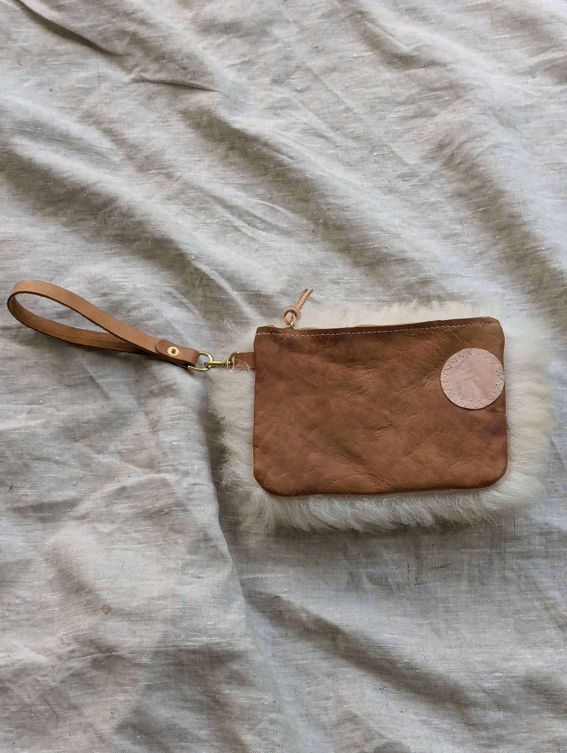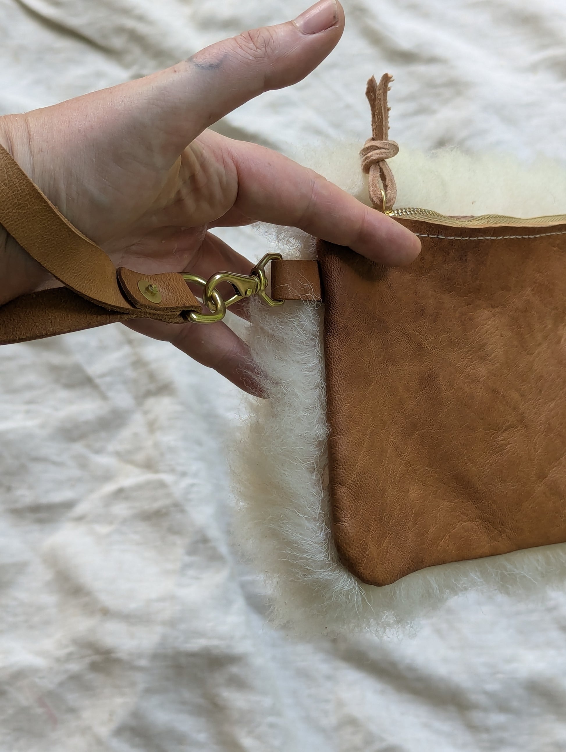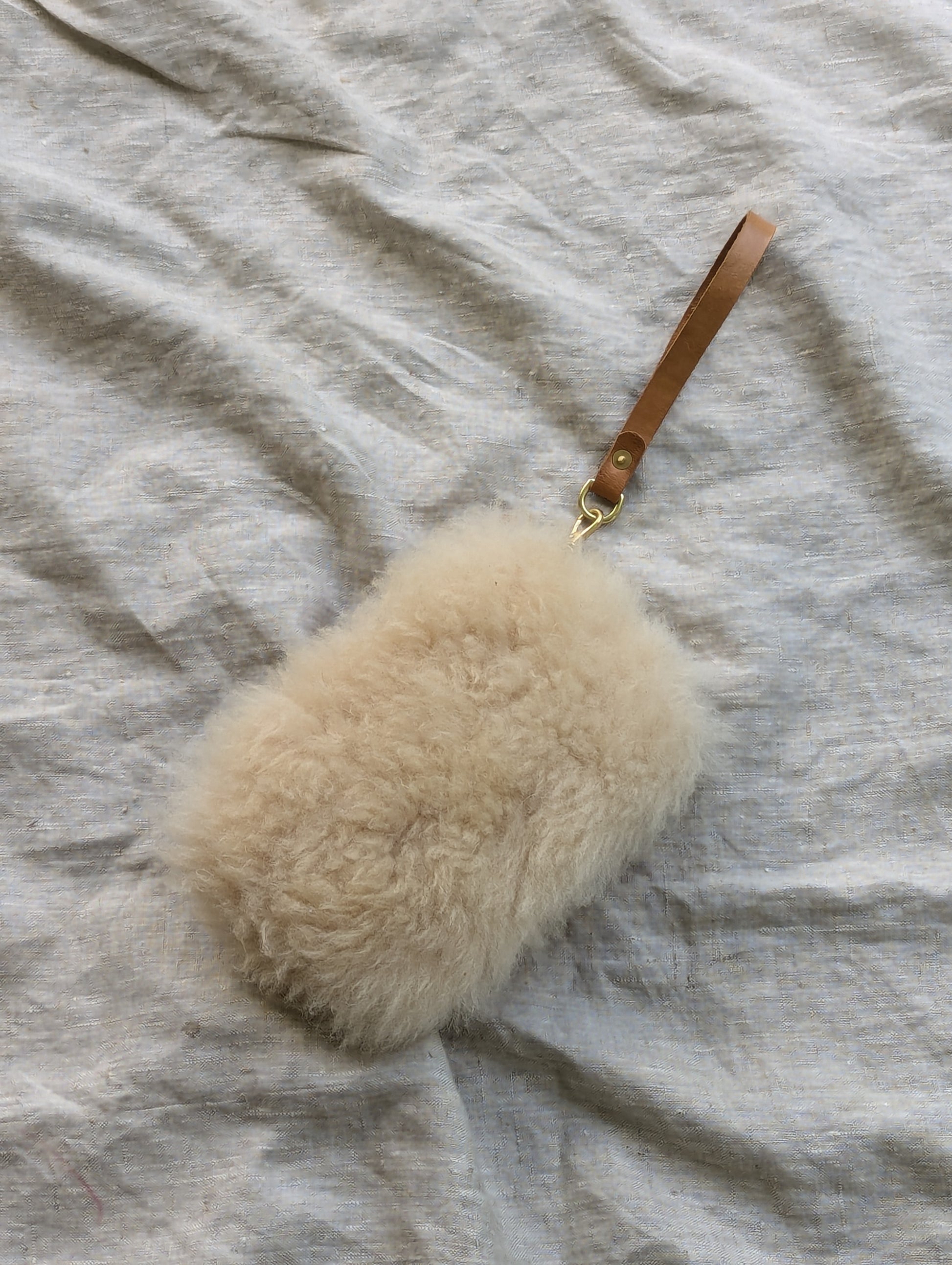 Fuzzy white sheepskin pouch with solid brass swivel snap, a heavy duty Riri zipper, and an optional deer leather wrist / belt strap. Clip it directly to your belt loops for hands free wear, or slip the wrist strap over your wrist or belt.