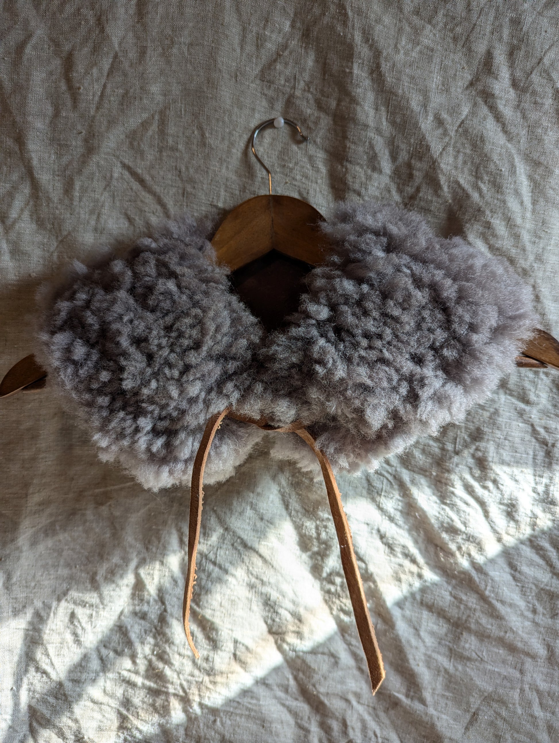 Sheepskin collar dyed to a charcoal grey with purple undertones with logwood bark, and tanoak bark tanned deer suede ties. This larger style is worn on the shoulders.