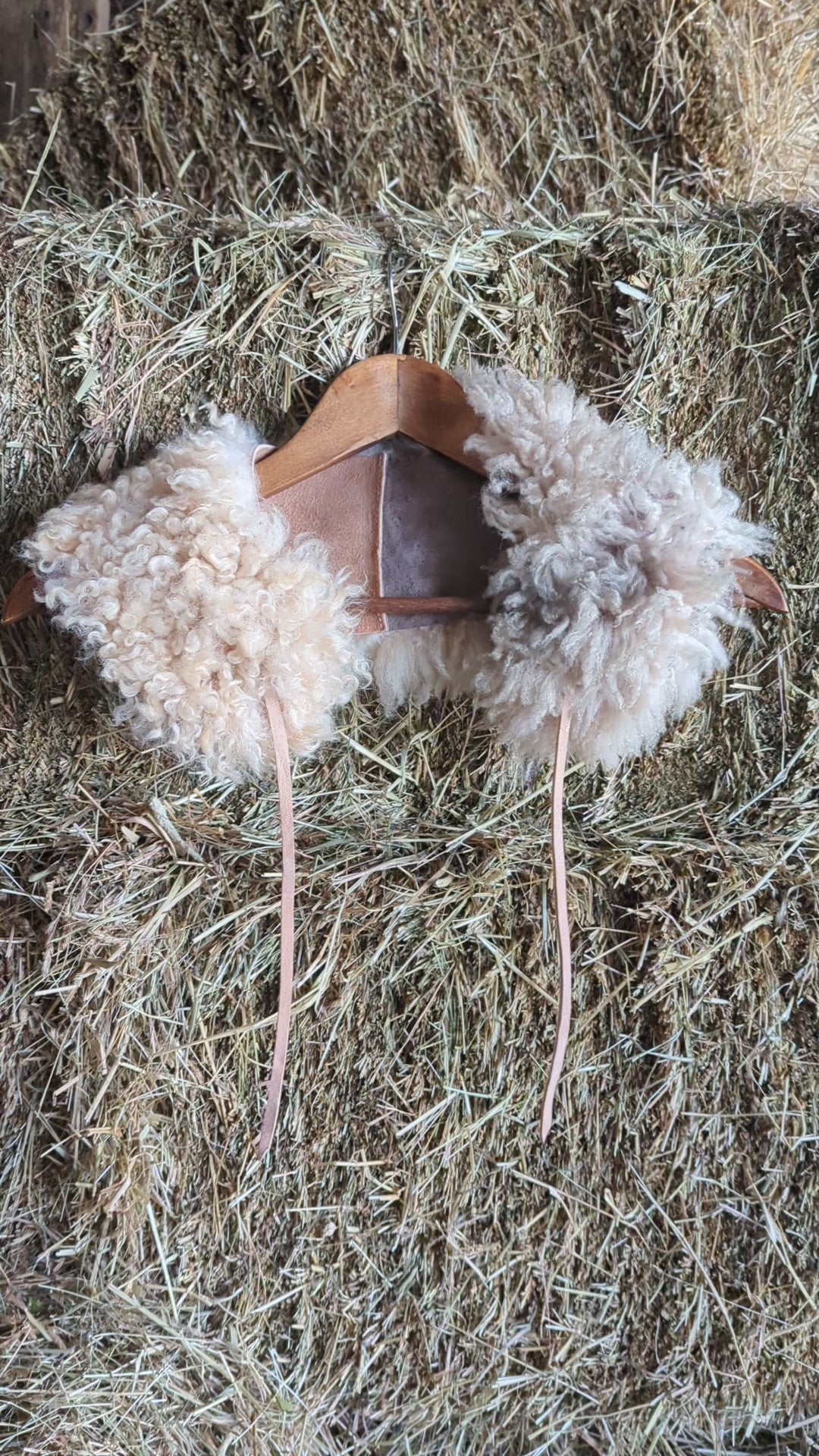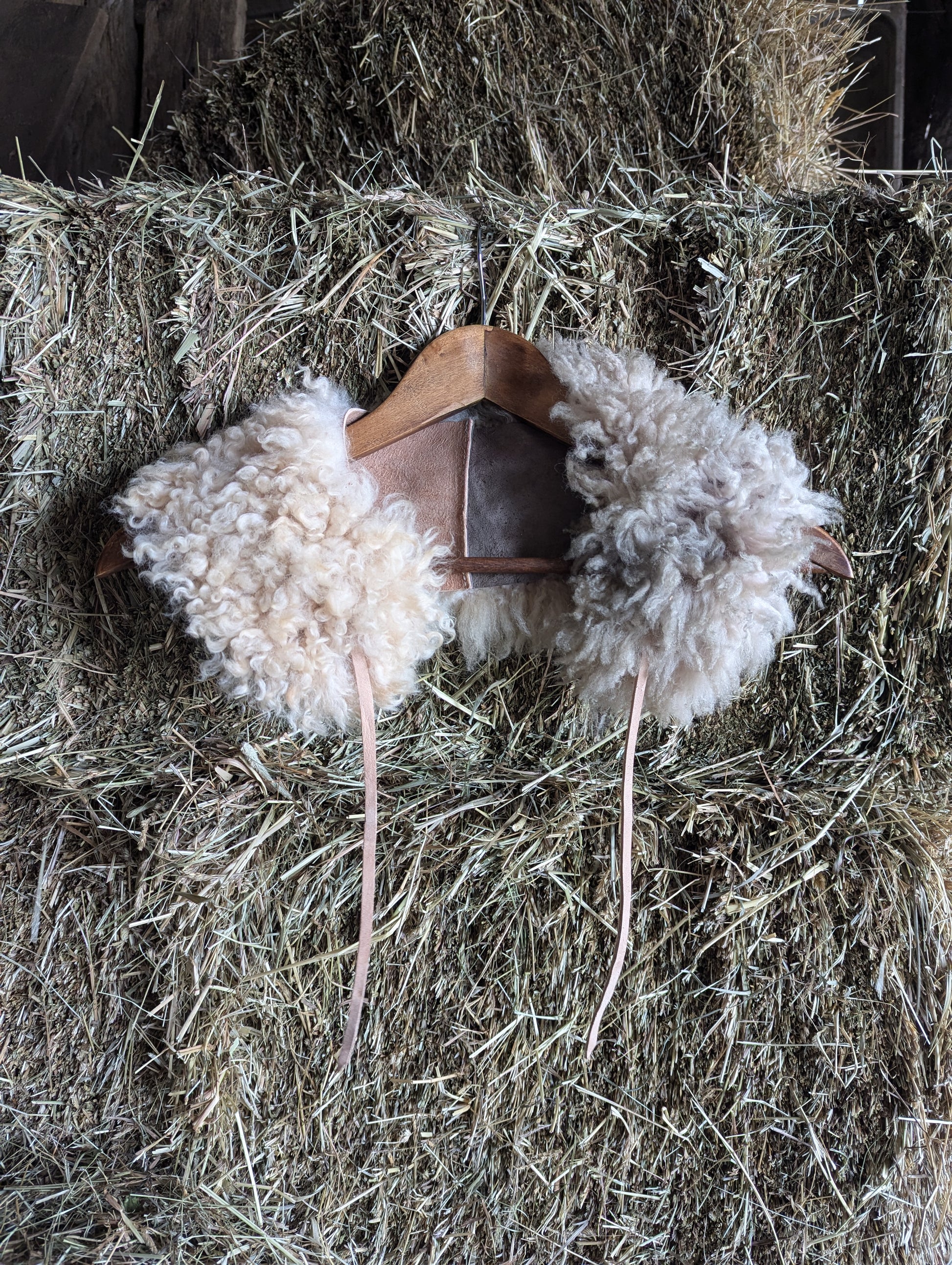 Shorter length curly half ivory white and half pale smokey grey sheepskin collar with 10" long mimosa tanned sheep suede ties. This larger style is worn on the shoulders. Dyed with alum + logwood + iron.