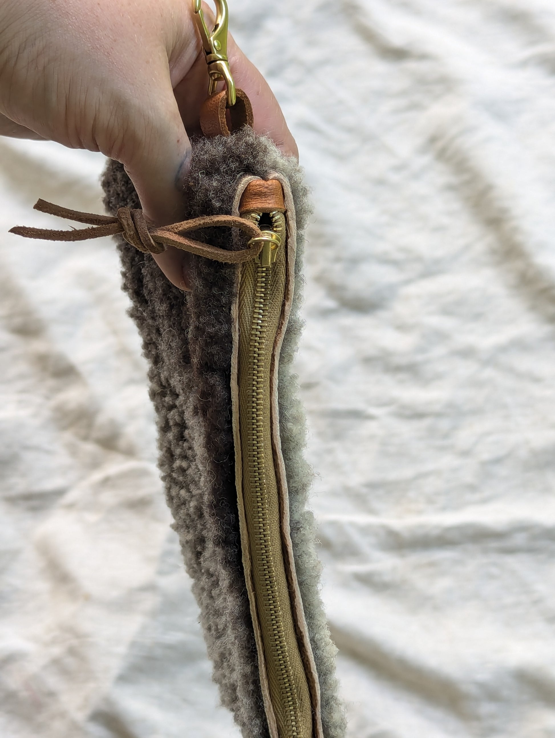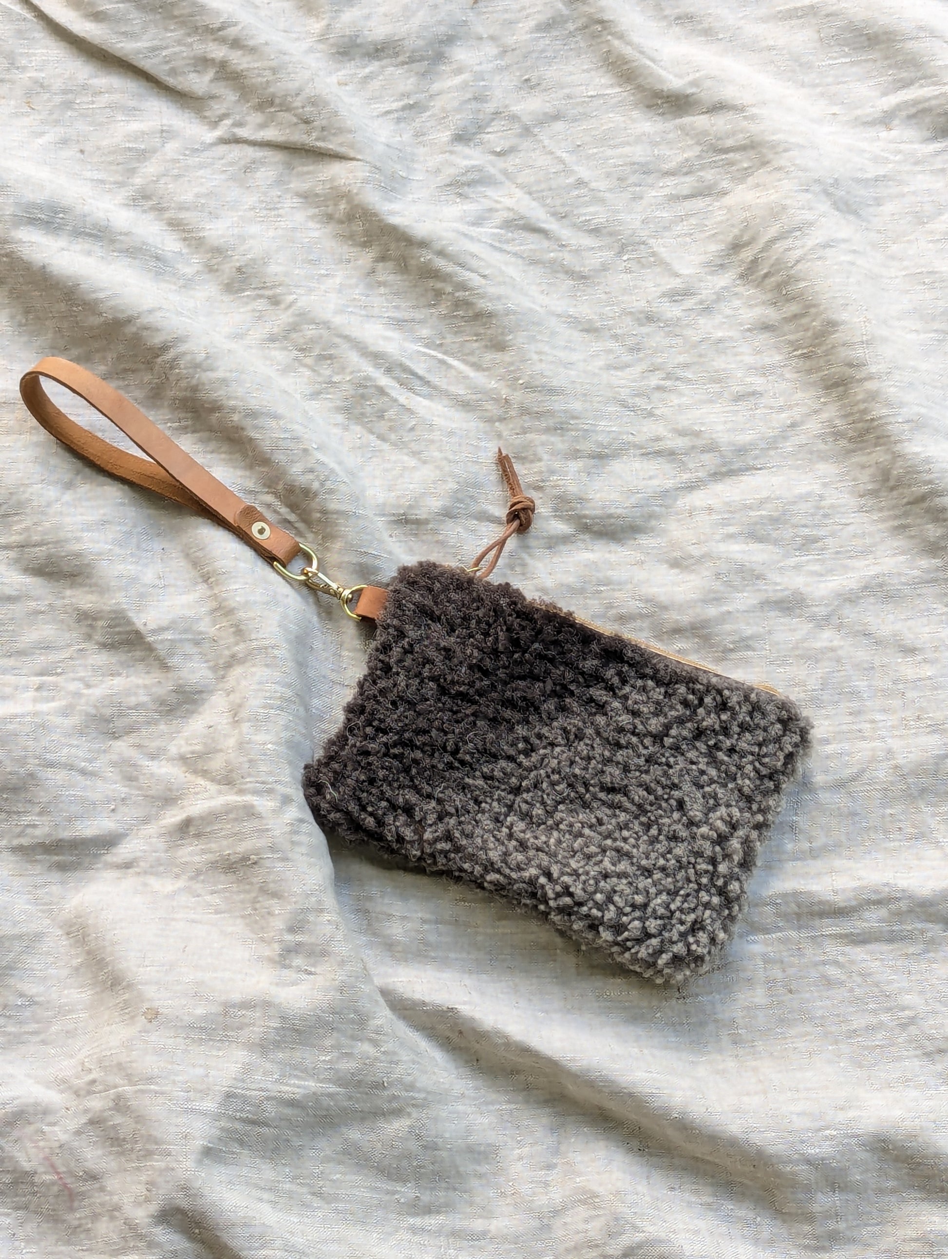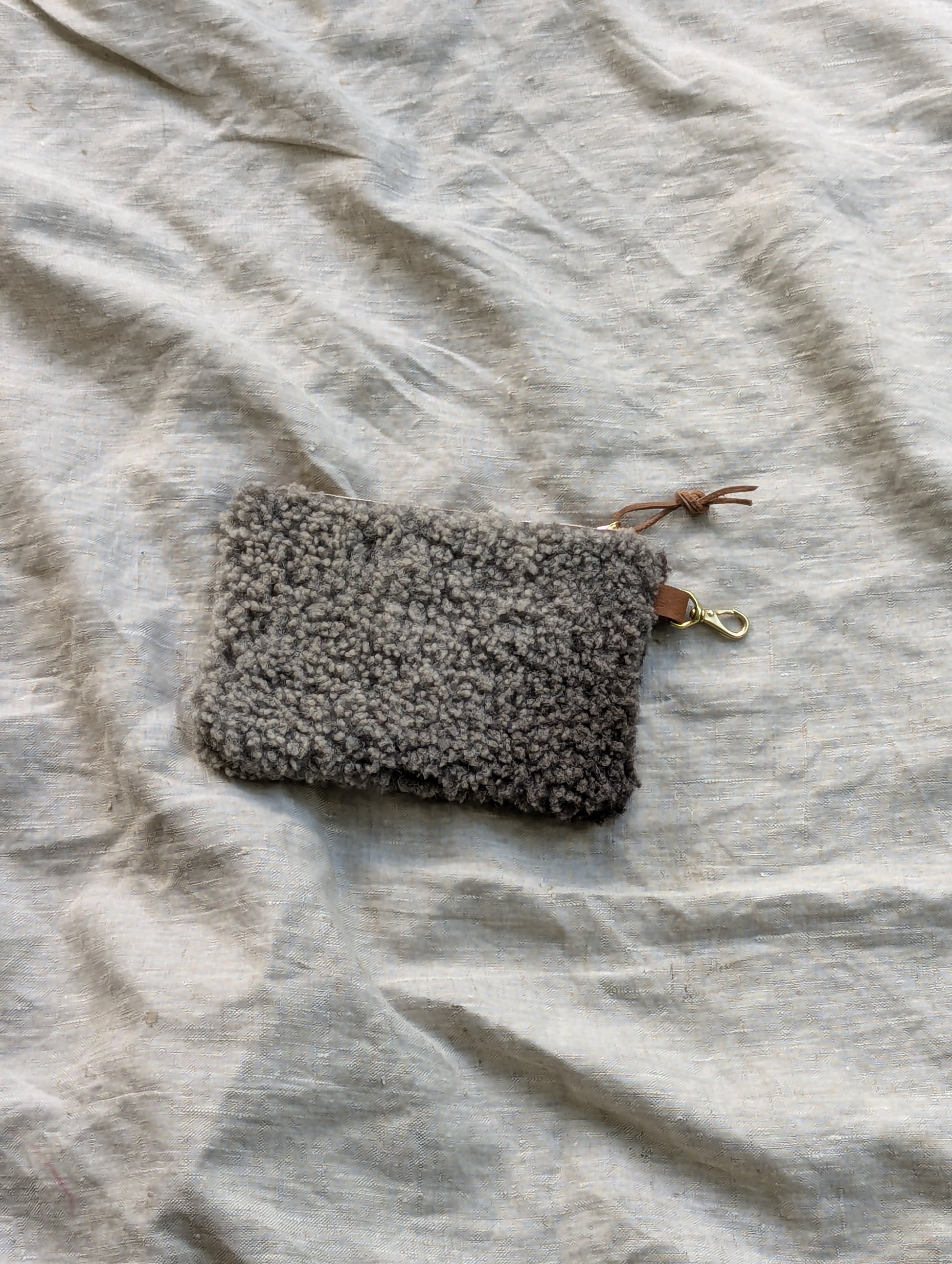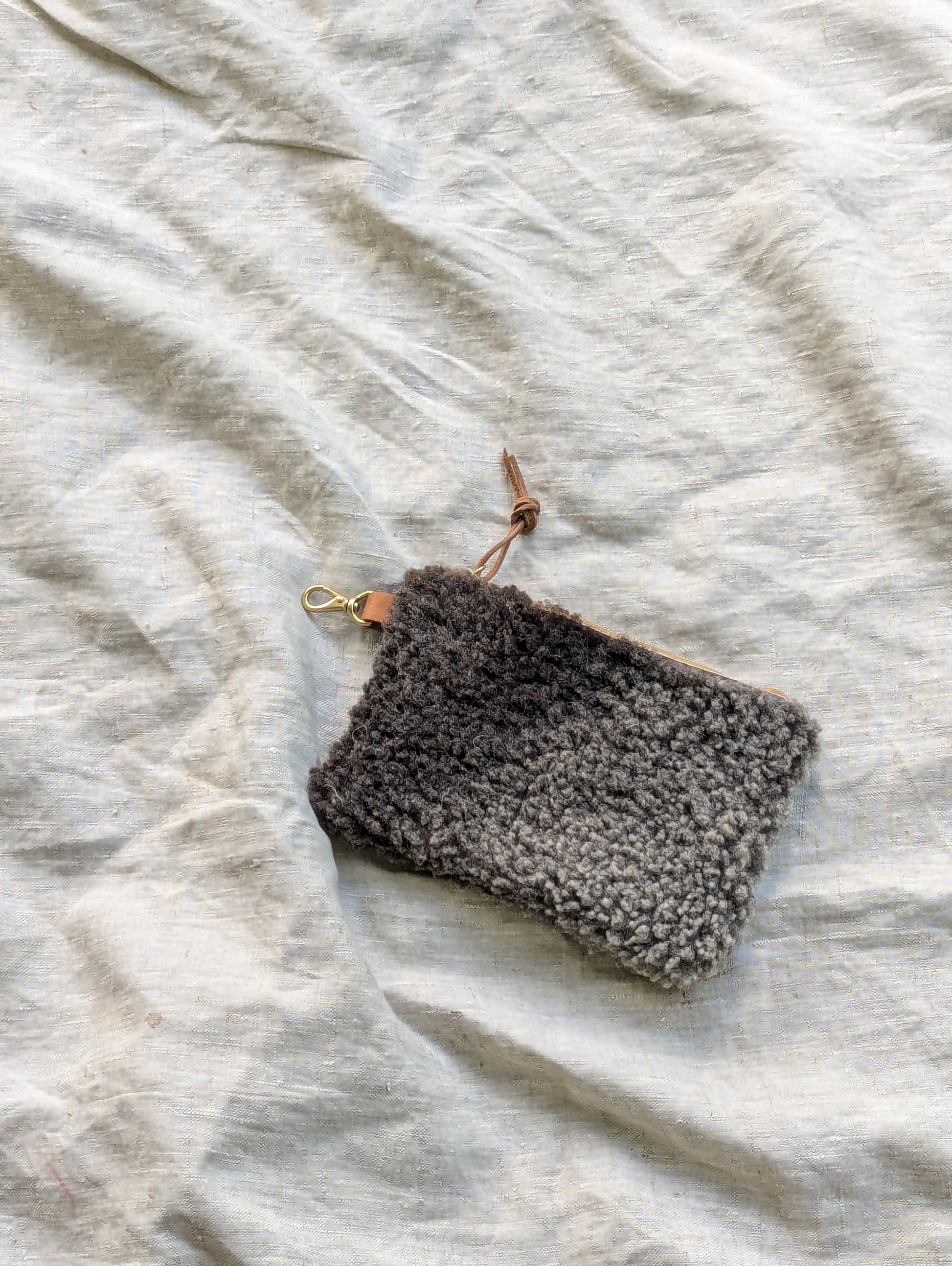 Fuzzy grey and black sheepskin pouch with wool on both sides, solid brass swivel snap, a heavy duty Riri zipper, and an optional deer leather wrist / belt strap. Clip it directly to your belt loops for hands free wear, or slip the wrist strap over your wrist or belt.