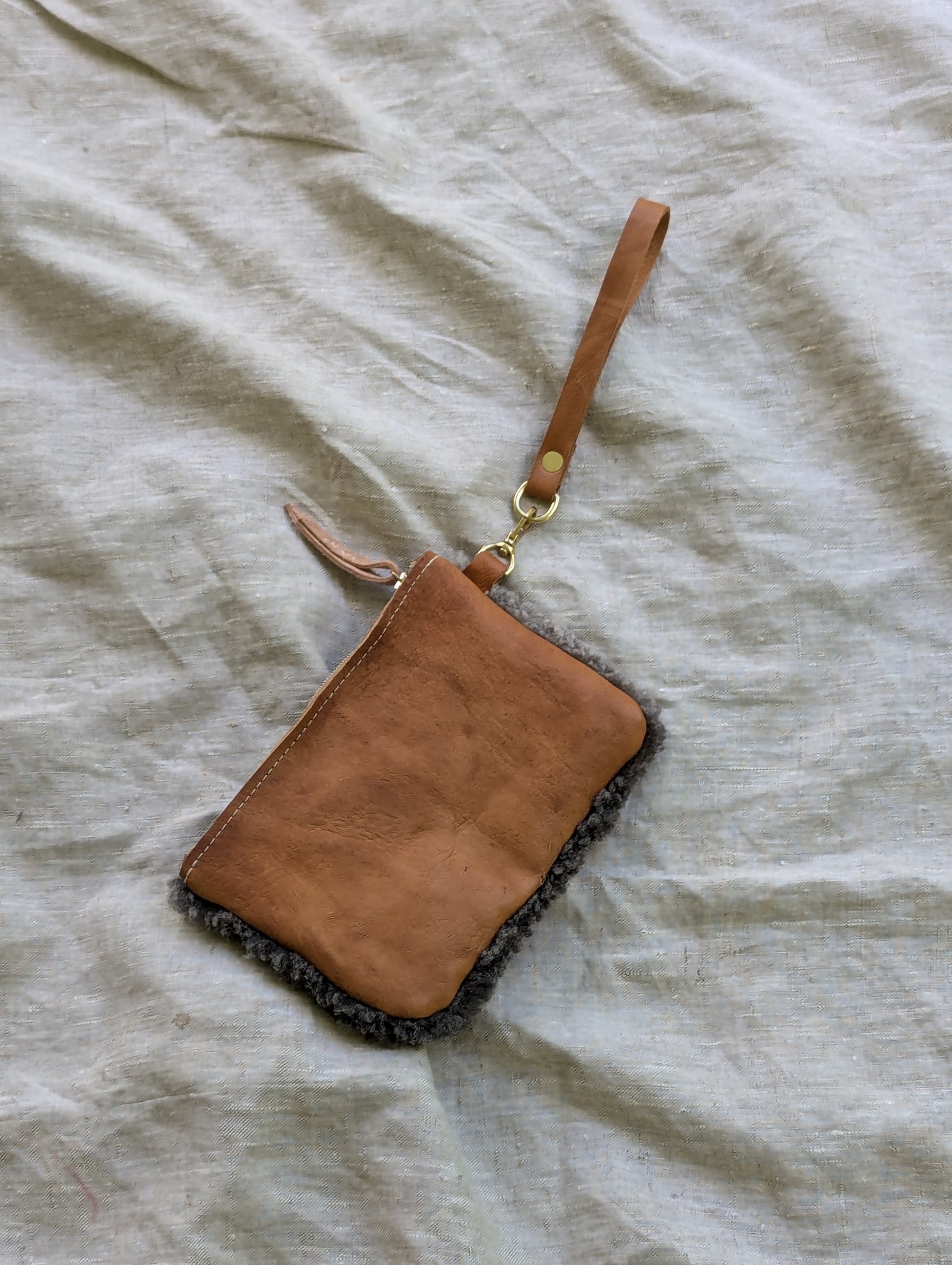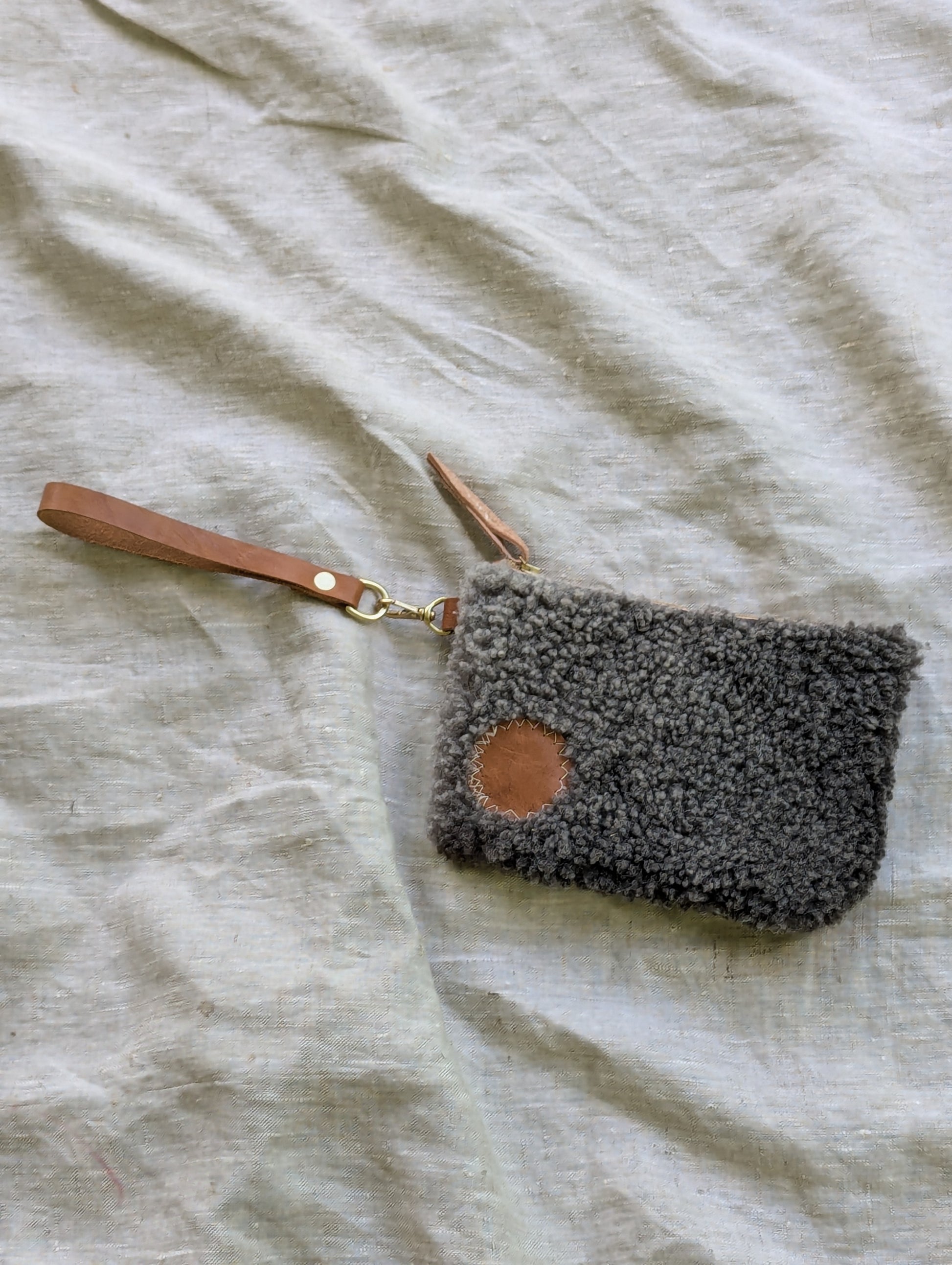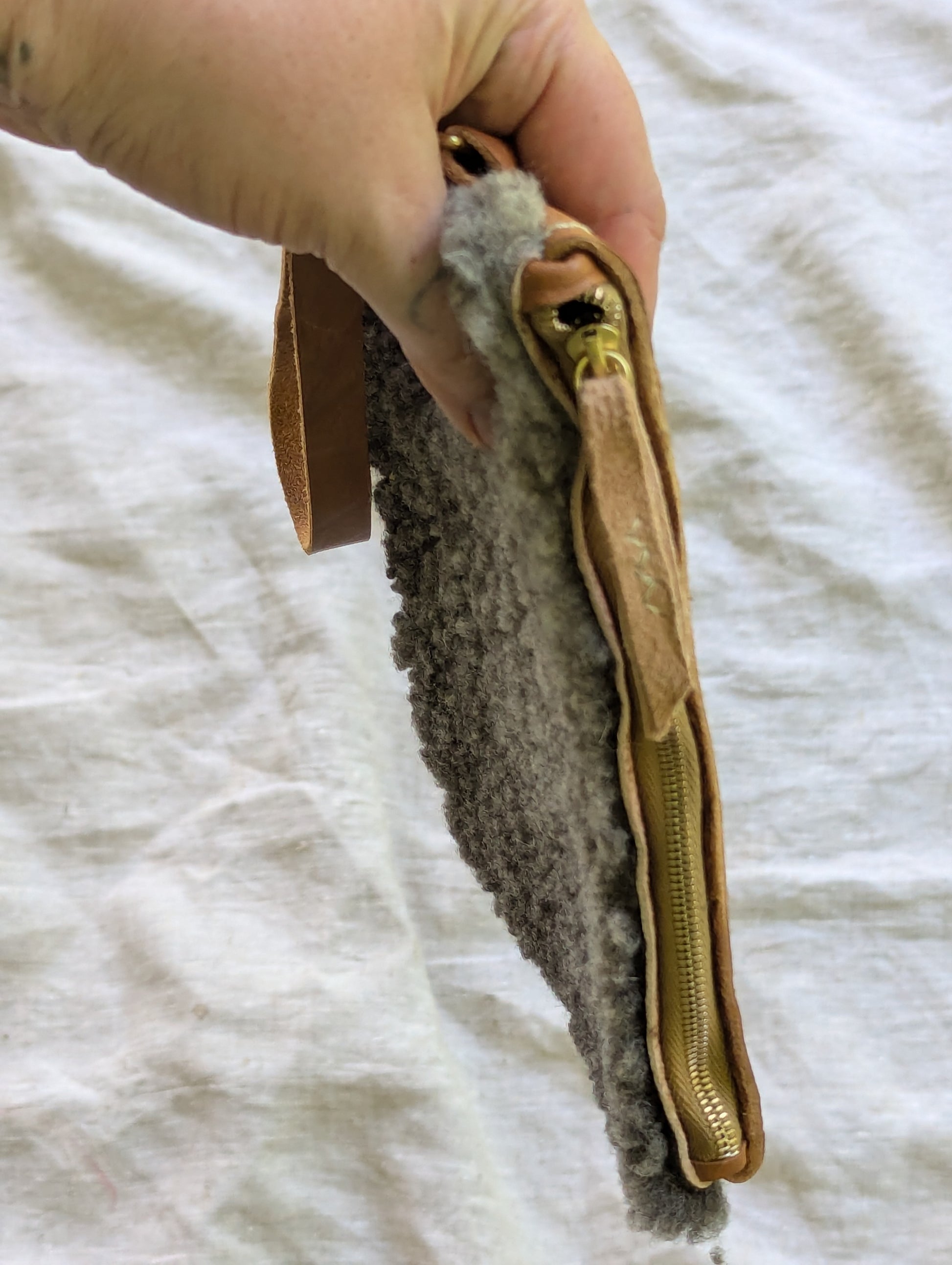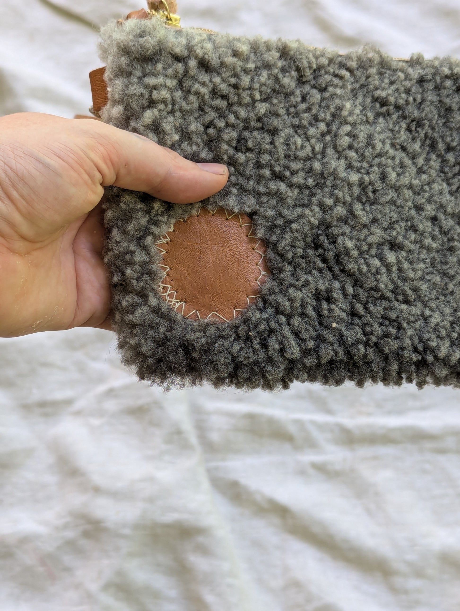 Fuzzy grey and black sheepskin pouch with tanoak sheepskin back, solid brass swivel snap, a heavy duty Riri zipper, and an optional deer leather wrist / belt strap. Clip it directly to your belt loops for hands free wear, or slip the wrist strap over your wrist or belt. ** This bag is offered at a slight discount for some minor flaws in the leather back that do not affect the function. See last photo. **