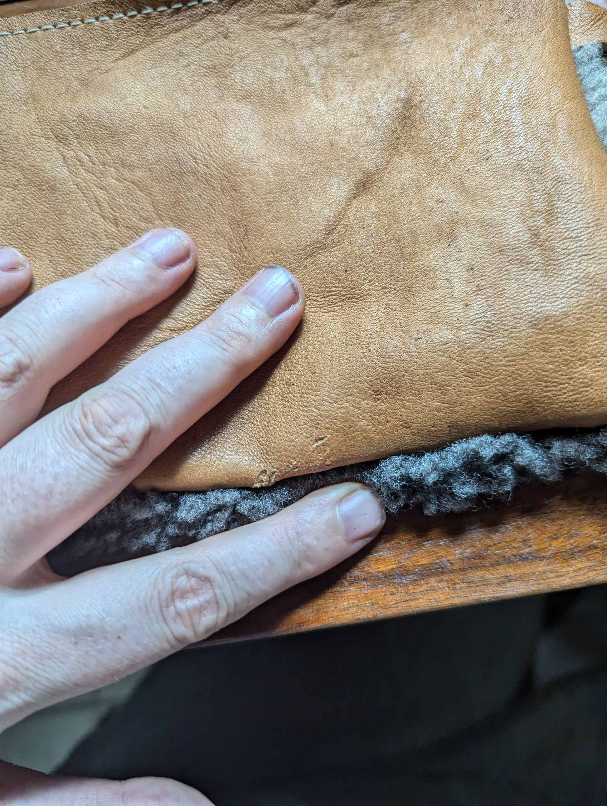 Made from mimosa tanned wooly sheepskin, tanoak bark tanned sheepskin leather, and tanoak bark tanned deerskin leather straps - all tanned and sewn by me.