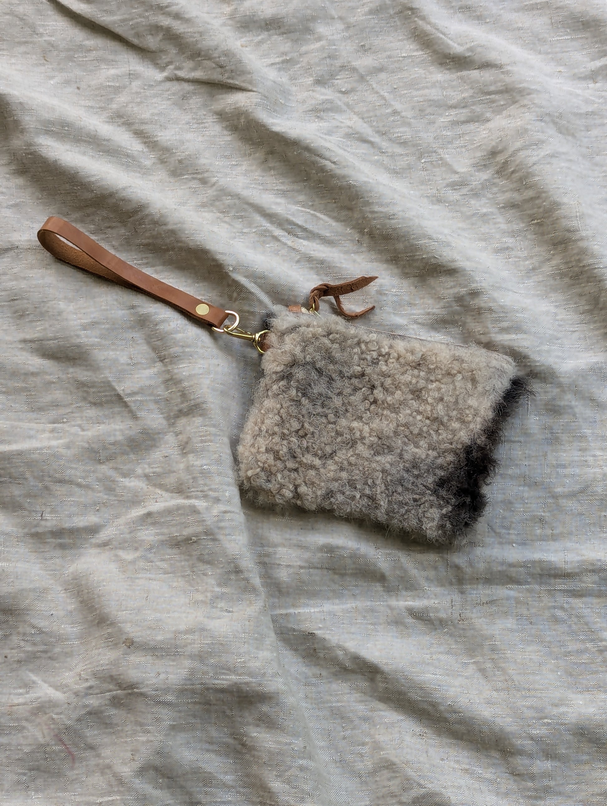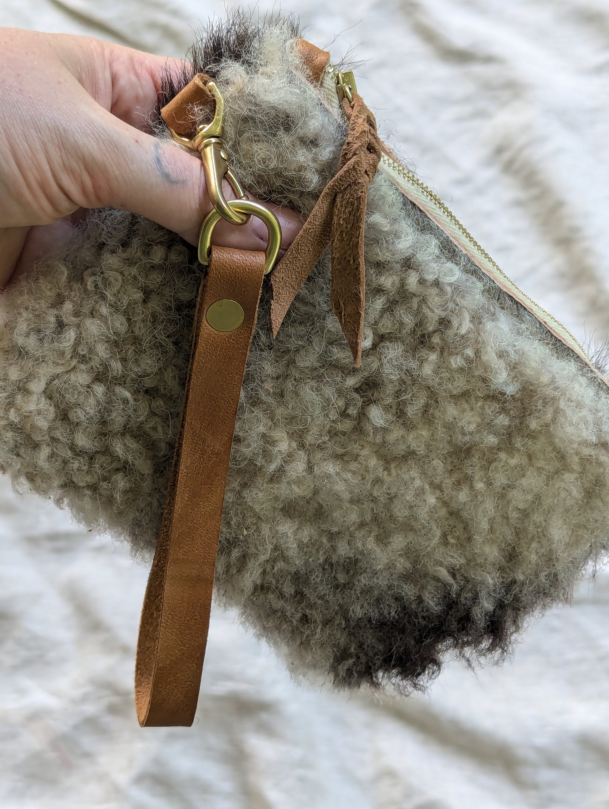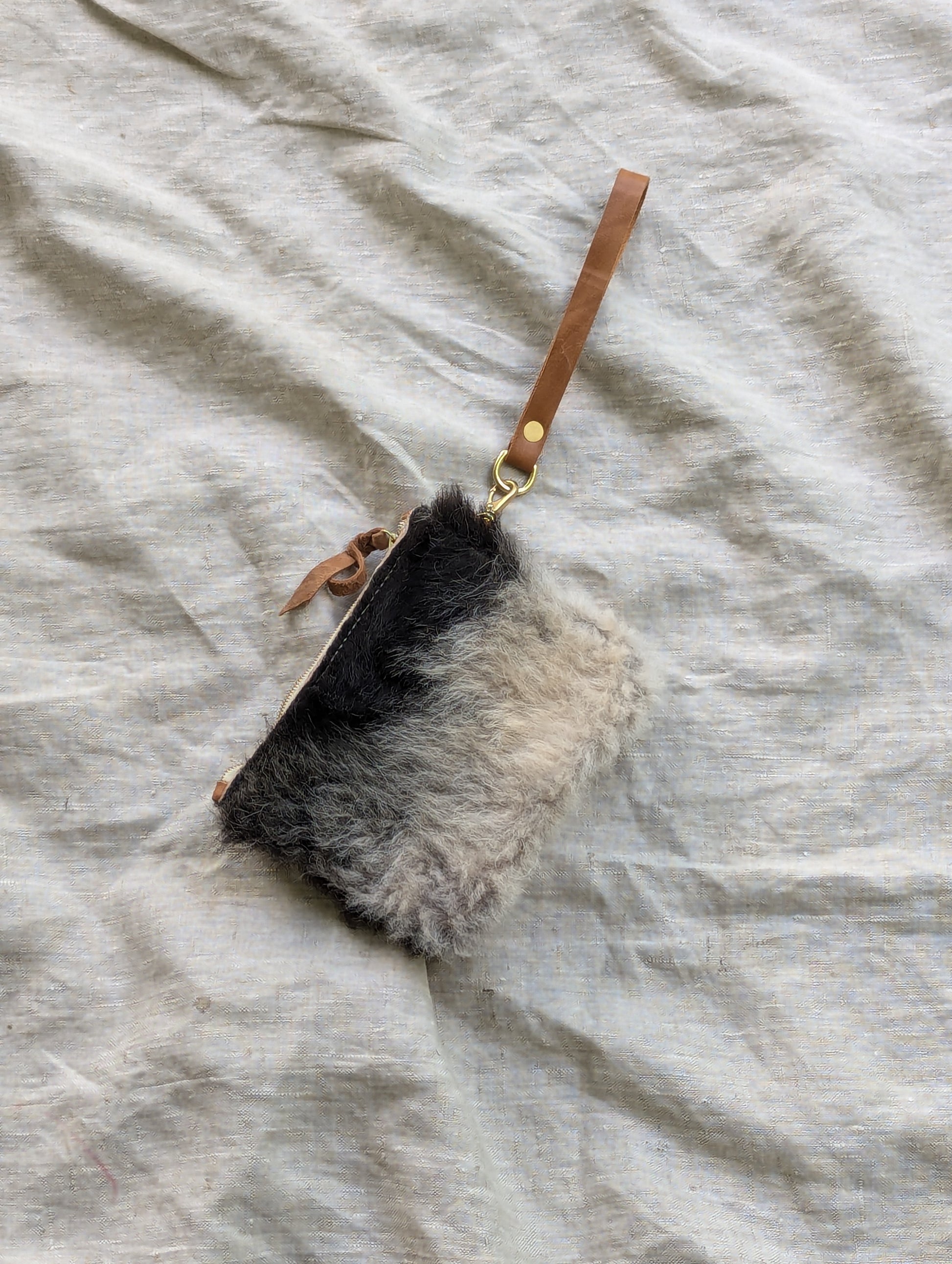 Fuzzy grey and black sheepskin pouch with wool on both sides, solid brass swivel snap, a heavy duty Riri zipper, and an optional deer leather wrist / belt strap. Clip it directly to your belt loops for hands free wear, or slip the wrist strap over your wrist or belt. ** This bag is much smaller than the others and will not fit a modern smartphone, but is more like a large wallet. **