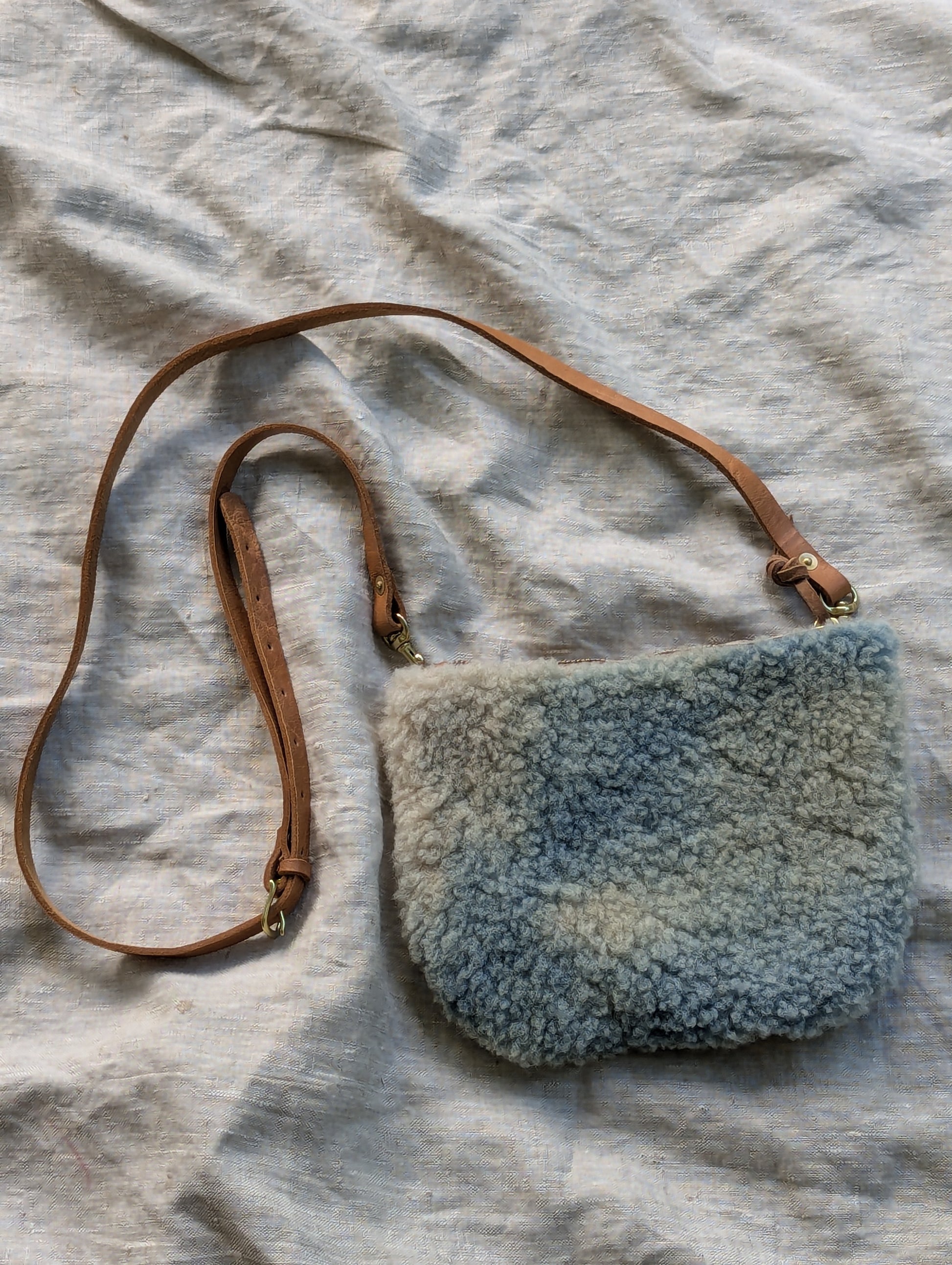 Fuzzy indigo dyed sheepskin pouch with solid brass hardware, a heavy duty Riri zipper, and adjustable straps for a relaxed crossbody or shoulder fit. Designed to fit your phone, wallet, and a few small items like balms, jewelry, a pocket knife, etc. This bag was made from an indigo dyed sheepskin dyed by Liv Klingaman (Feral Fibers) with japanese indigo grown in Kentucky by Among the Oaks Herb Farm.