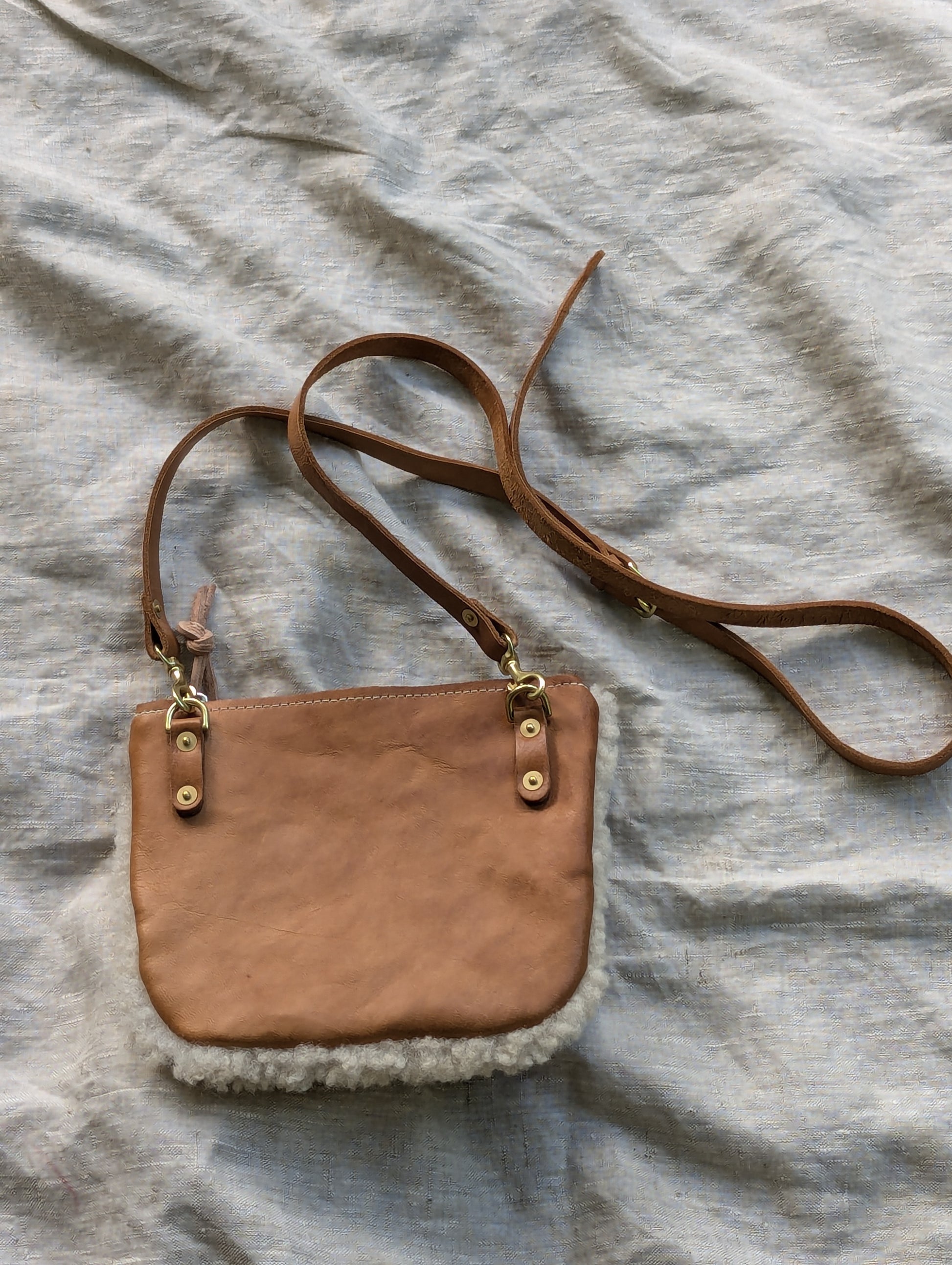 Made from mimosa tanned wooly sheepskin, tanoak bark tanned sheepskin leather, and tanoak bark tanned deerskin leather straps - all tanned and sewn by me.