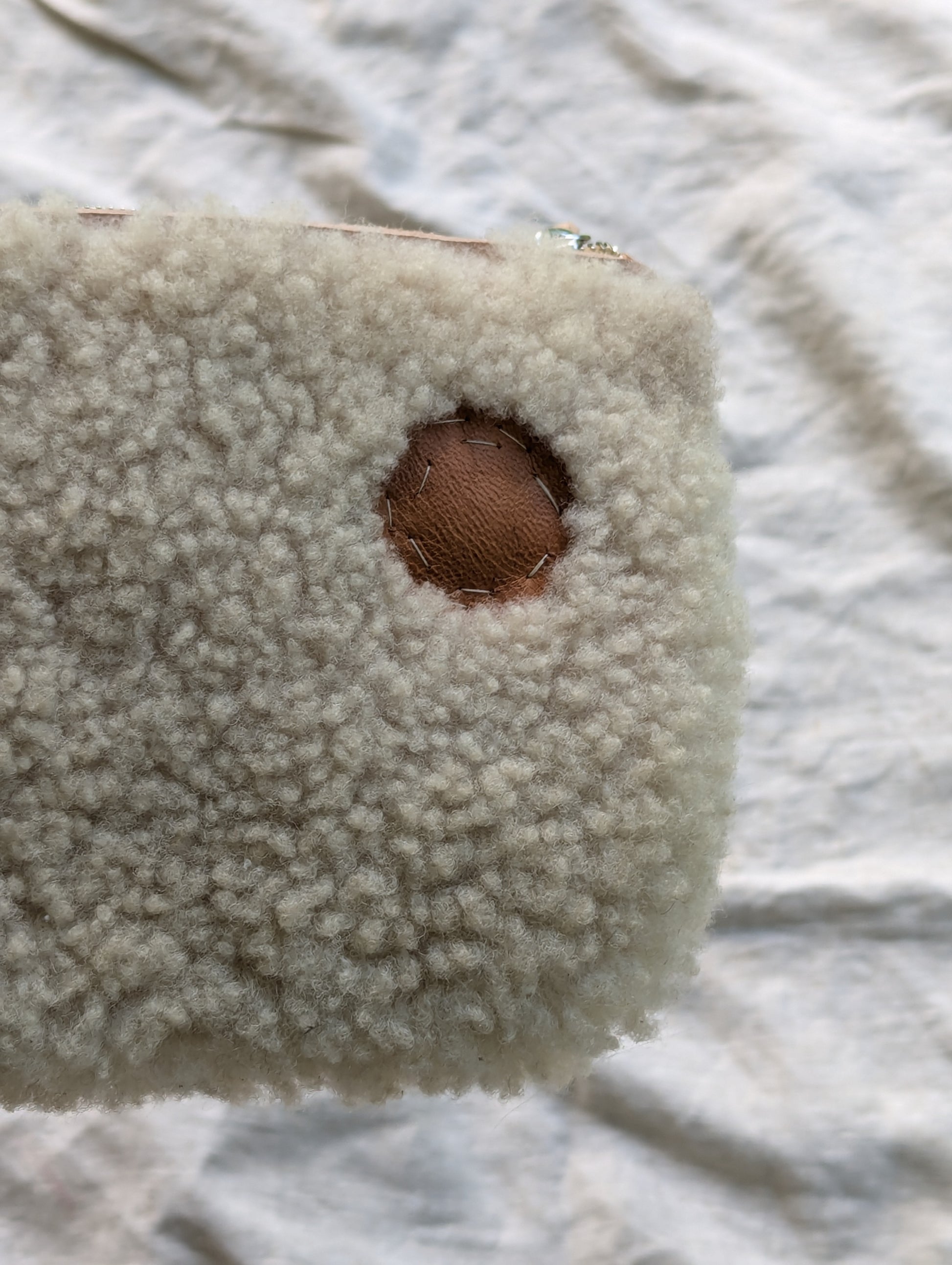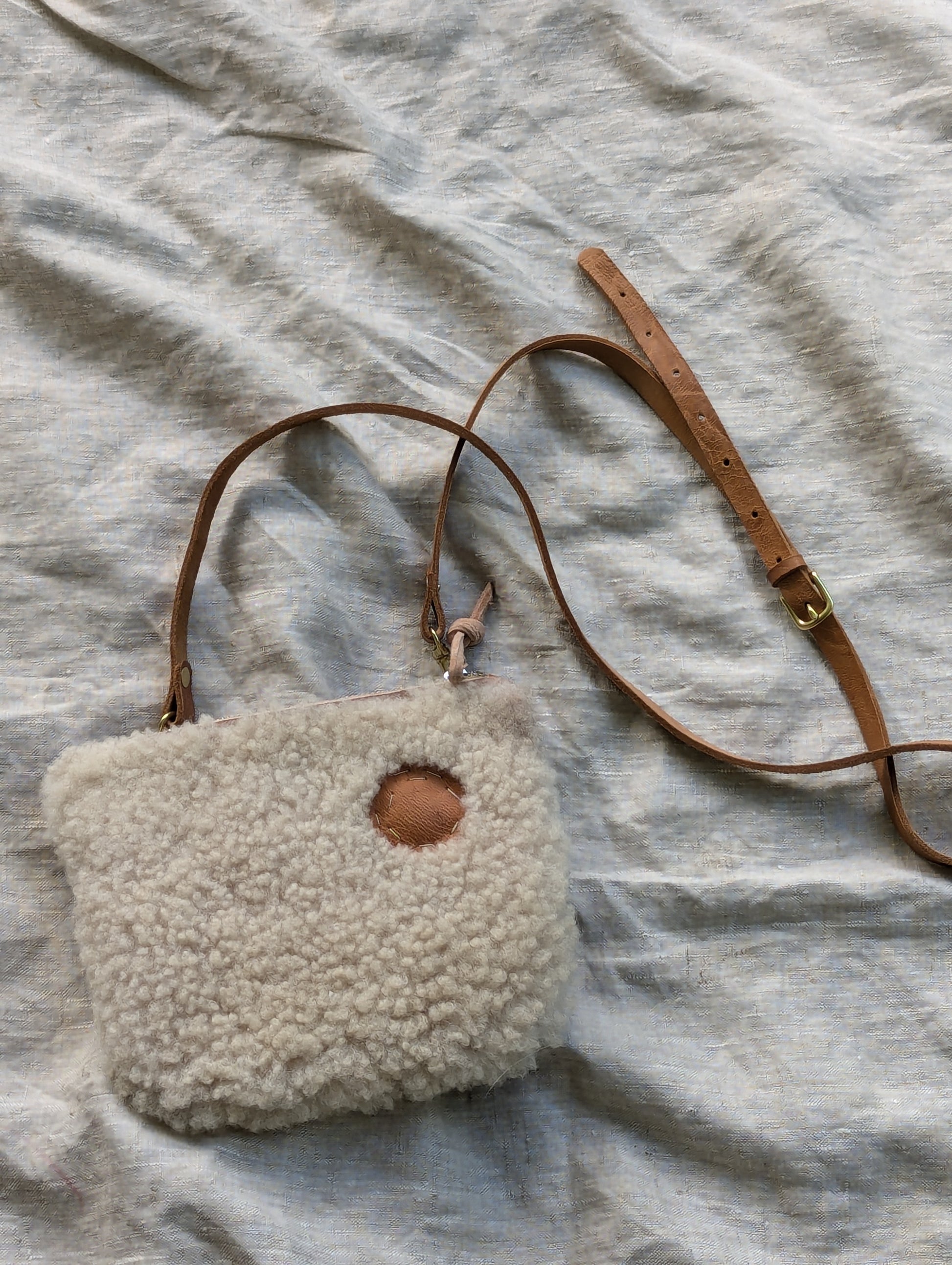 Fuzzy white sheepskin pouch with solid brass hardware, a heavy duty Riri zipper, and adjustable straps for a relaxed crossbody or shoulder fit.