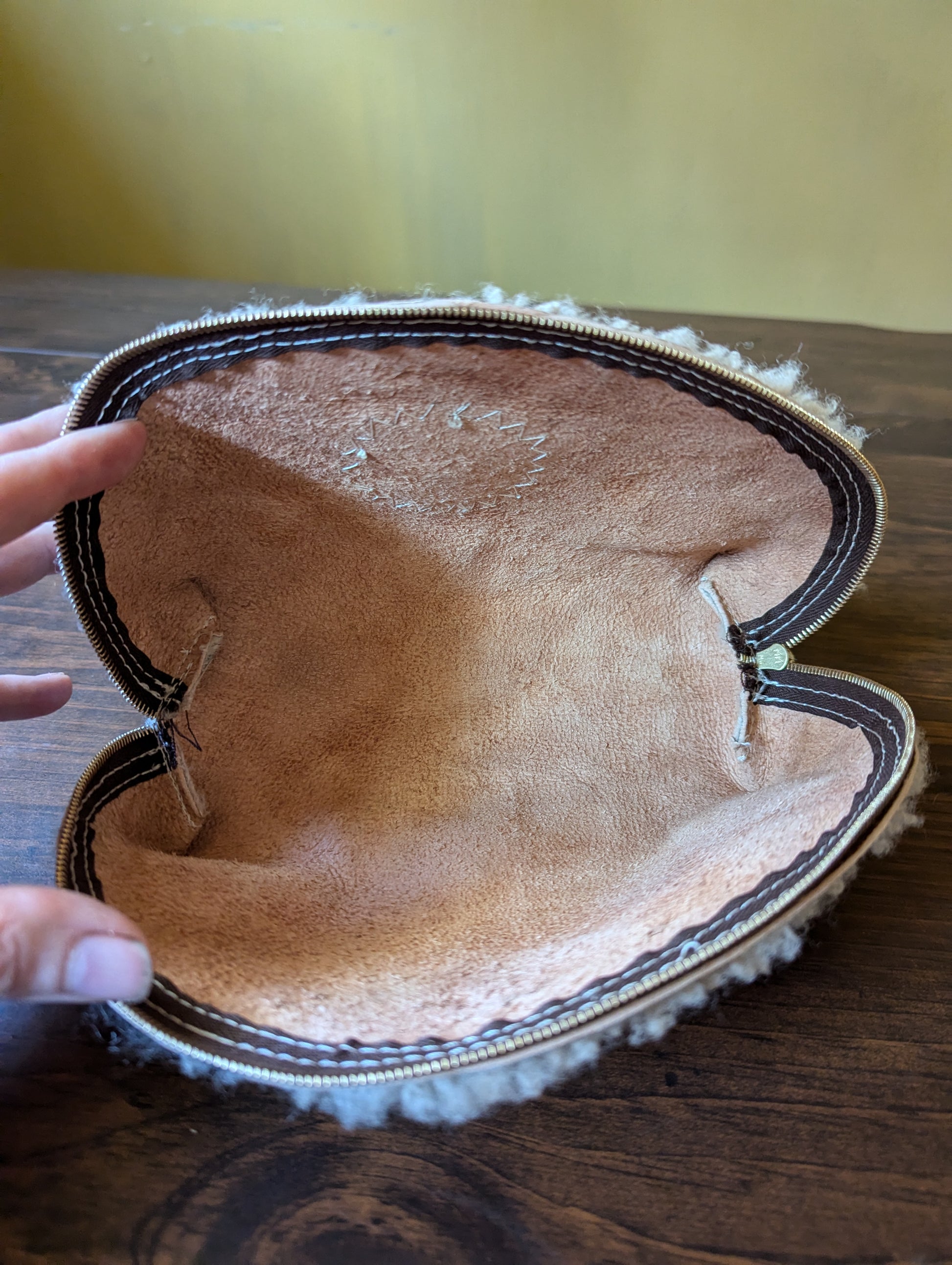 Fuzzy oatmeal grey sheepskin pouch with a chunky brass zipper, perfect for carrying toiletries or tinctures in your larger bag, or as a clutch. Patched with tan oak bark tanned sheepskin on one side.