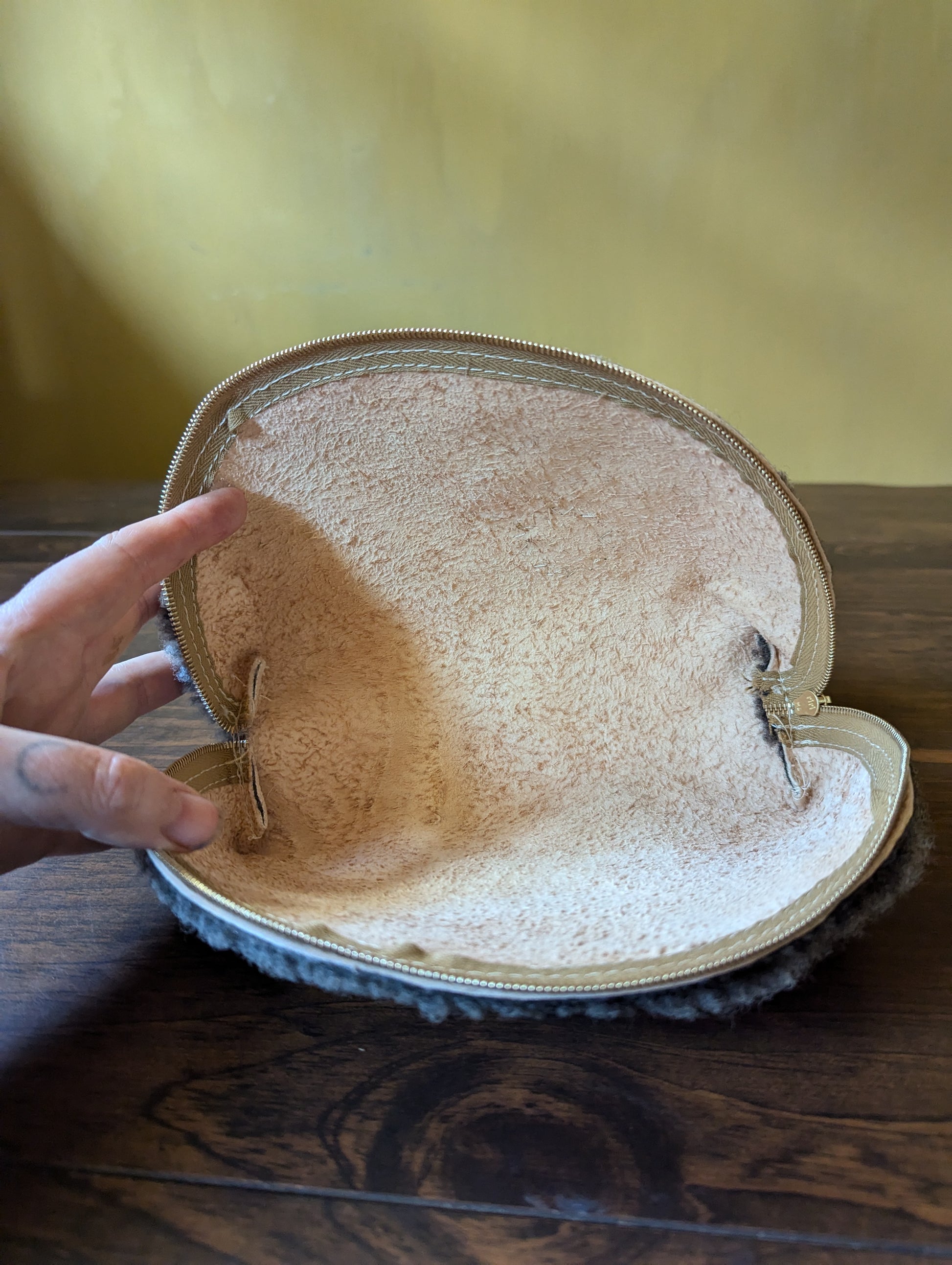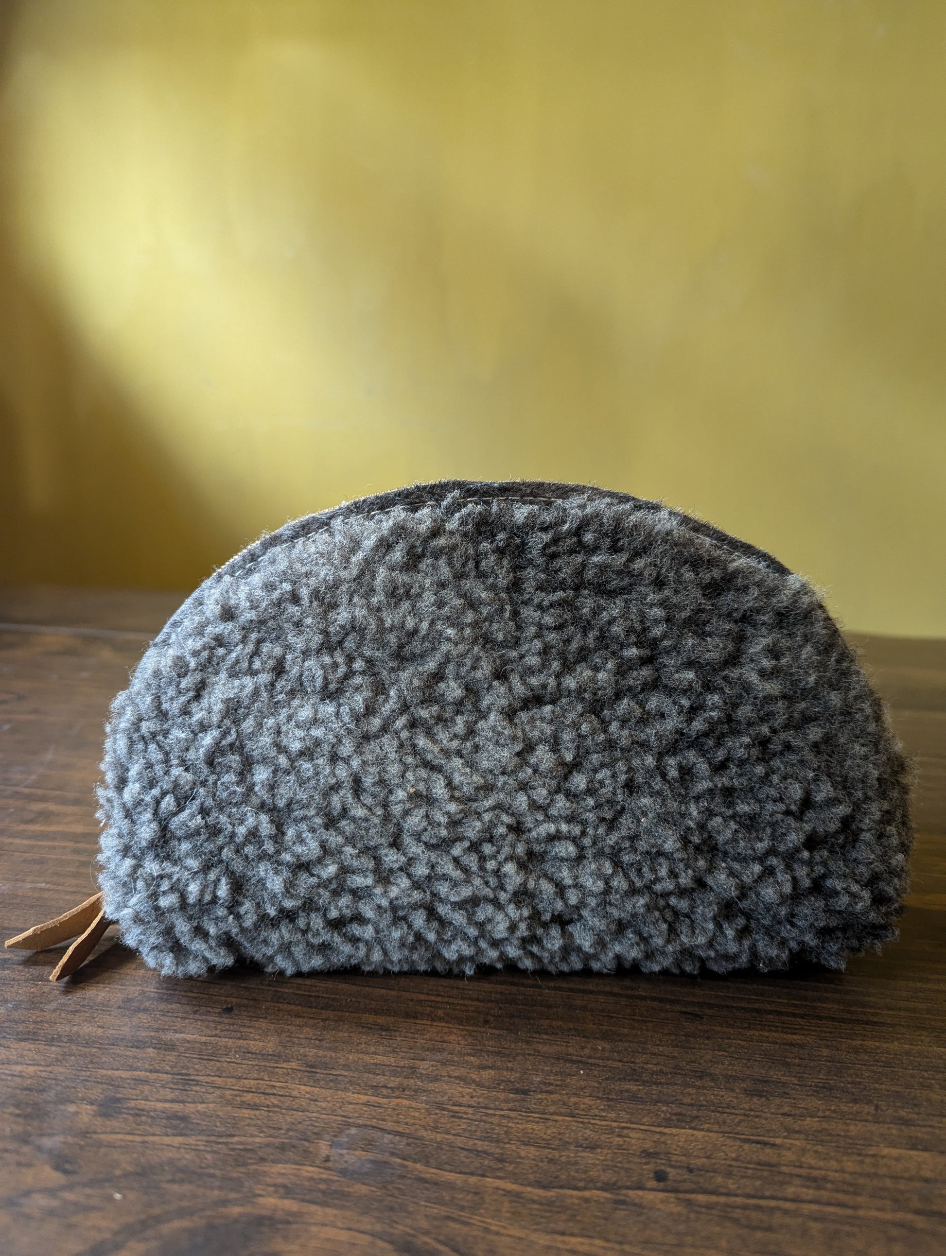 Fuzzy oatmeal grey sheepskin pouch with a chunky brass zipper, perfect for carrying toiletries or tinctures in your larger bag, or as a clutch. Patched with tan oak bark tanned sheepskin on one side.