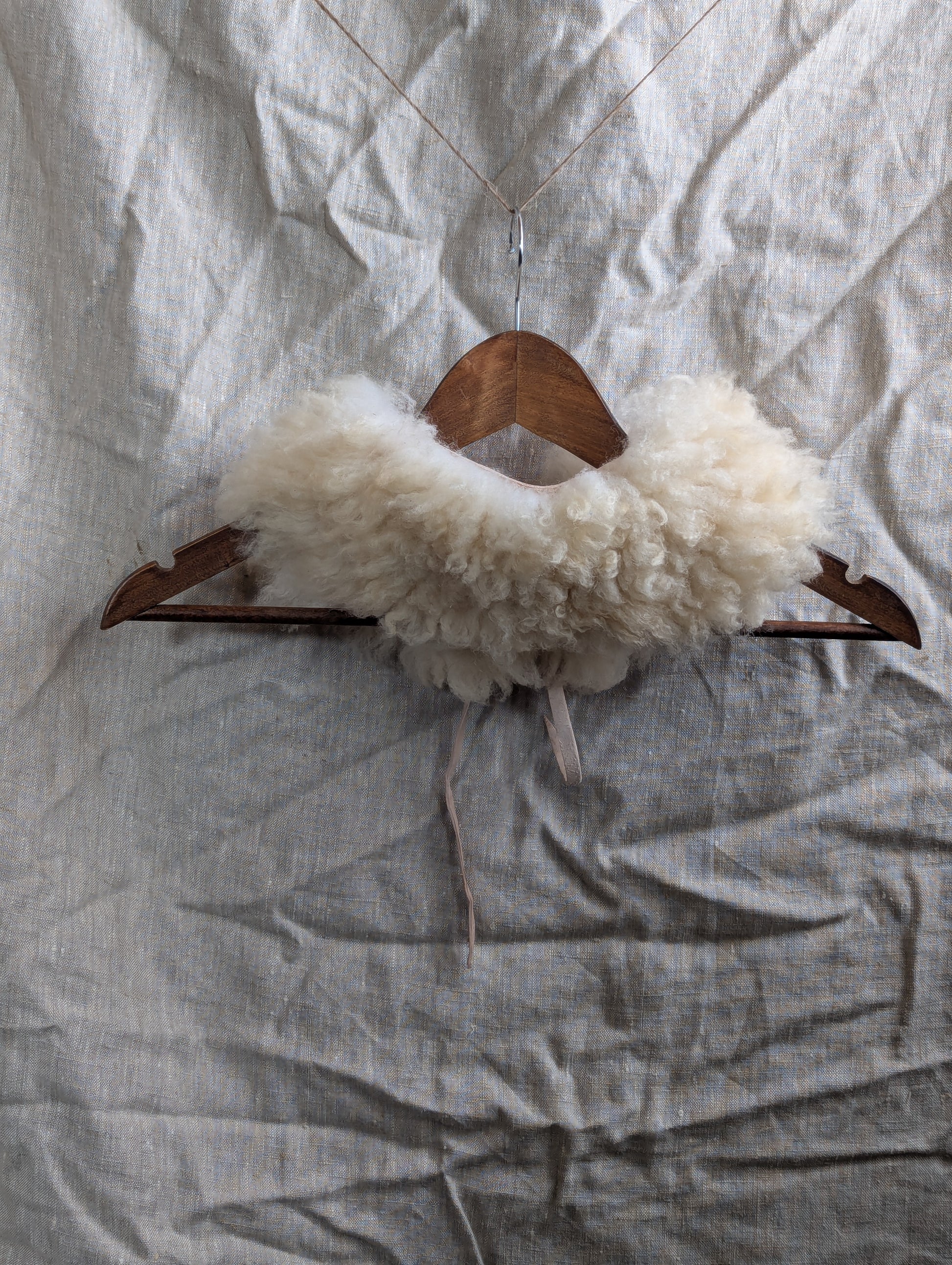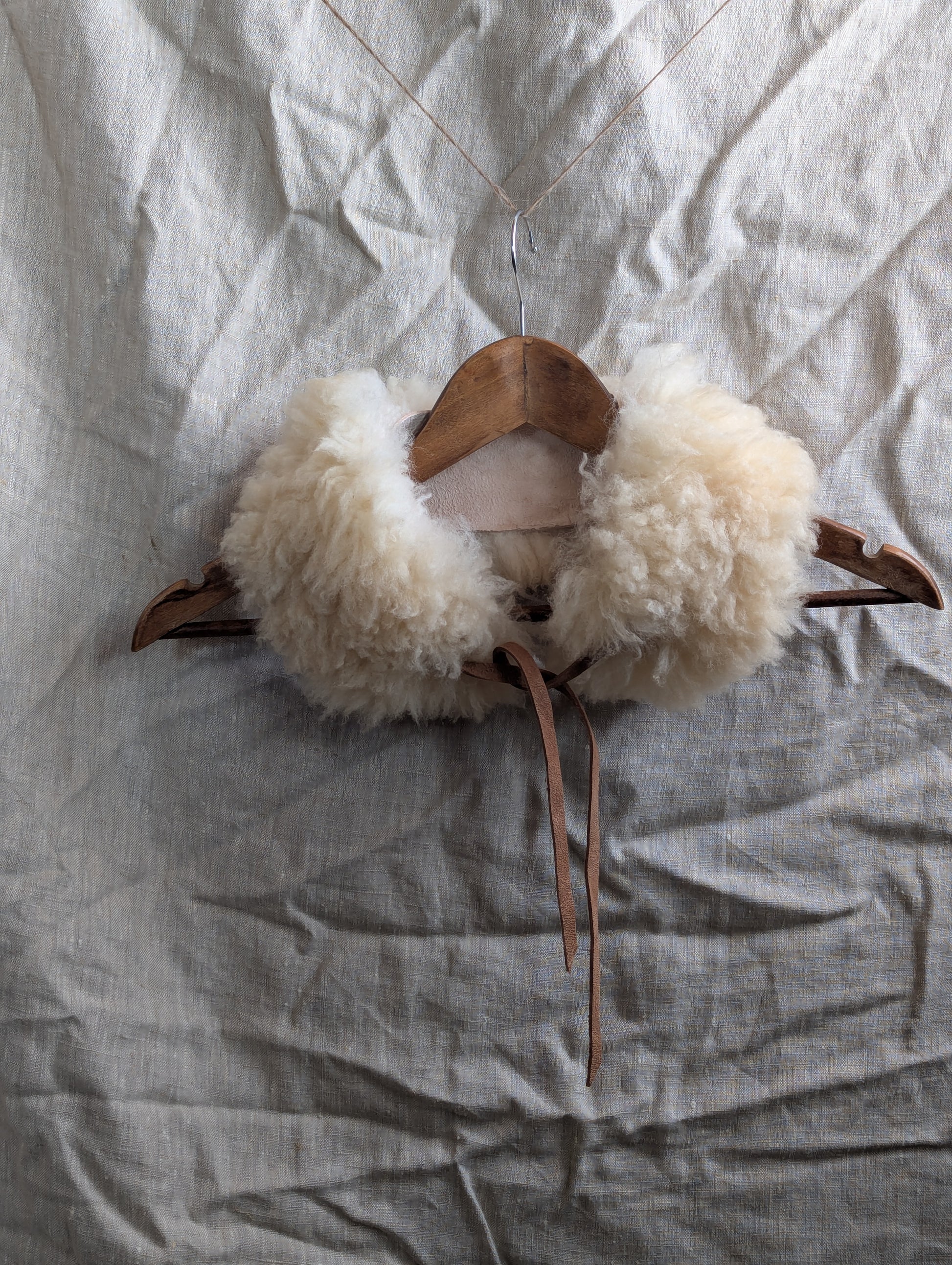 The classic - natural curly white sheepskin collars with long thin laces in your choice of laces in light pink (mimosa tanned) or rich, warm brown (tanoak bark tanned). Note that the mimosa tanned laces will patina slightly with exposure to sun and your skin oils to more of a light bronze.