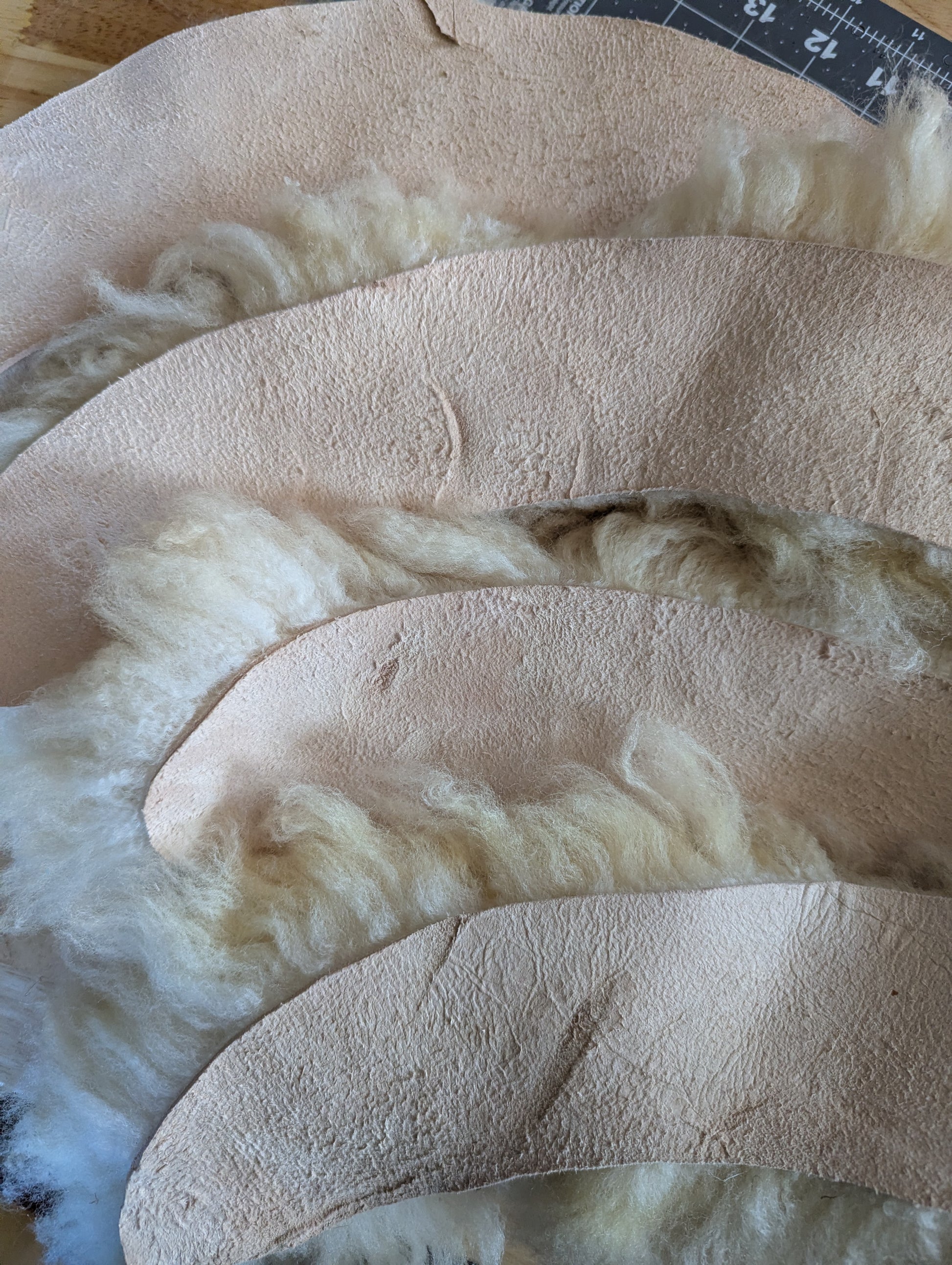 My sheepskins are tanned with mimosa (Acacia mearnsii) tannin extract, with additional ingredients used in the process including: salt, citric acid, soap, and distilled vinegar. They are softened with sheep tallow soap, sunflower seed lecithin, and sunflower oil.